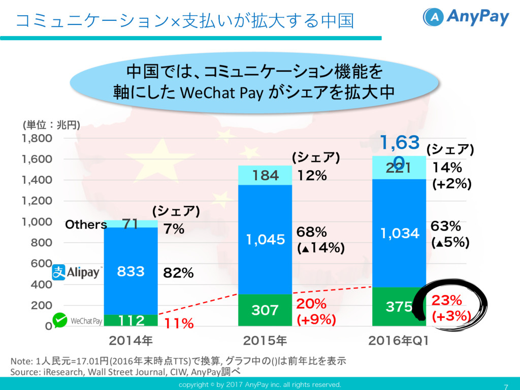DPQZSJHIUCZ"OZ1BZJOD BMMSJHIUTSFTFSWFE Note: 1人民元=17.01円(2016年末時点TTS)で換算, グラフ中の()は前年比を表示 Source: iResearch, Wall Street Journal,