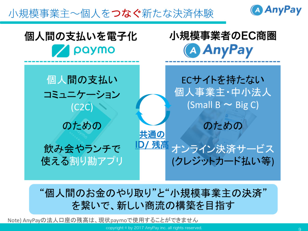 C) のための オンライン決済サービス (クレジットカード払い等) ݸਓؒͷࢧ͍ΛిࢠԽ のための 飲み会やランチで 使える割り勘アプリ 個人間の支払い コミュニケーション (C2C) “個人間のお金のやり取り”と“小規模事業主の決済” を繋いで、新しい商流の構築を目指す Note) AnyPayの法人口座の残高は、現状paymoで使用することができません ڞ௨ͷ *%ߴ