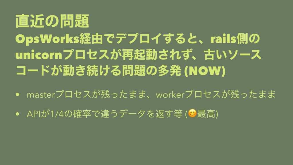 ۙͷ OpsWorksܦ༝ͰσϓϩΠ͢Δͱɺrailsଆͷ unicornϓϩηε͕࠶ىಈ͞Εͣɺݹ͍ιʔε ίʔυ͕ಈ͖ଓ͚Δͷଟൃ (NOW) • masterϓϩηε͕ͬͨ··ɺworkerϓϩηε͕ͬͨ·· • API͕1/4ͷ֬Ͱҧ͏σʔλΛฦ͢ (