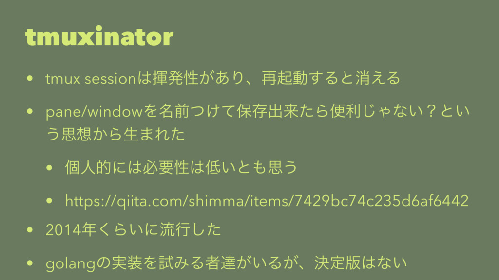 tmuxinator • tmux sessionشൃੑ͕͋Γɺ࠶ىಈ͢Δͱফ͑Δ • pane/windowΛ໊લ͚ͭͯอଘग़དྷͨΒศར͡Όͳ͍ʁͱ͍ ͏ࢥ͔Βੜ·Εͨ • ݸਓతʹඞཁੑ͍ͱࢥ͏ •