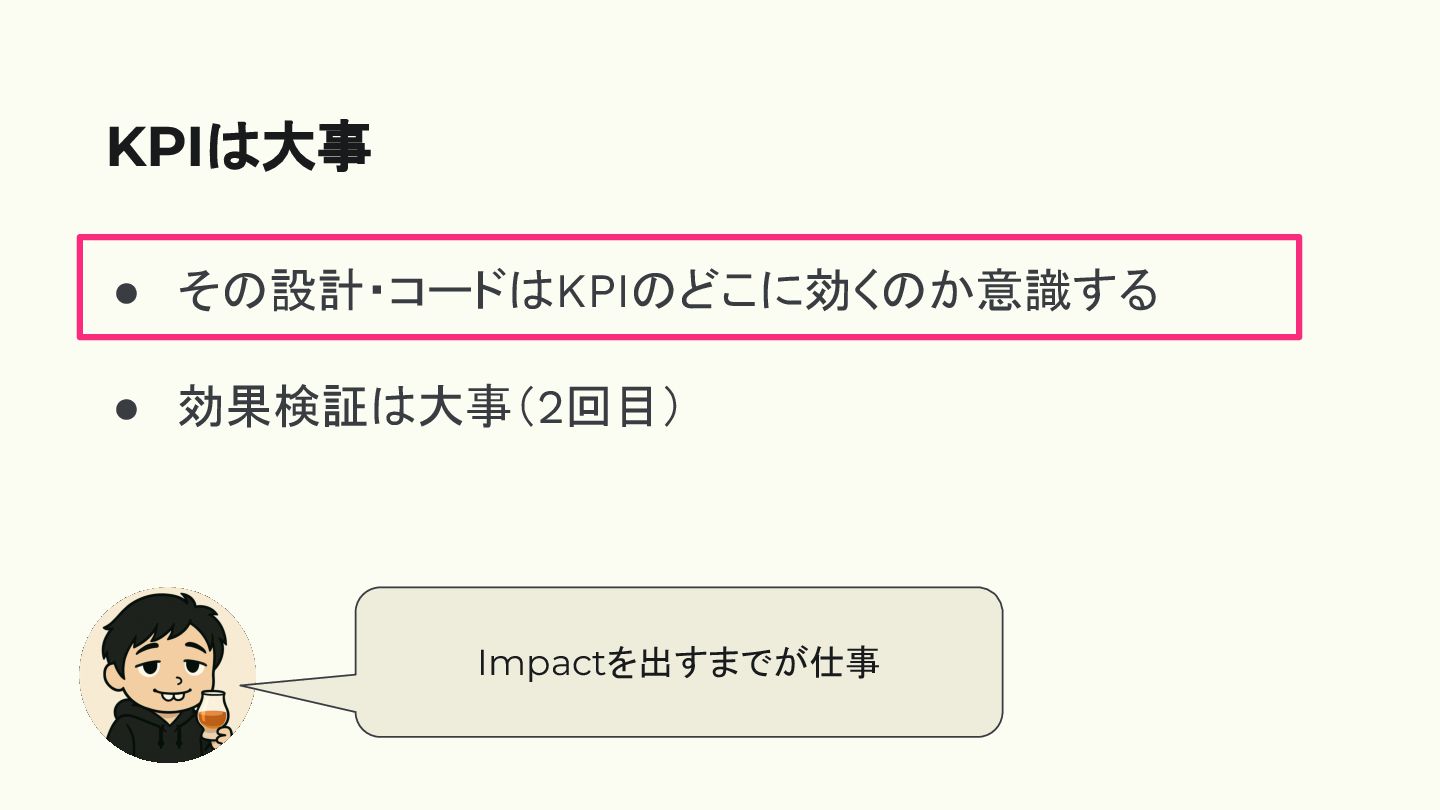• その設計・コードはKPIのどこに効くのか意識する • 効果検証は大事(2回目) KPIは大事 Impactを出すまでが仕事