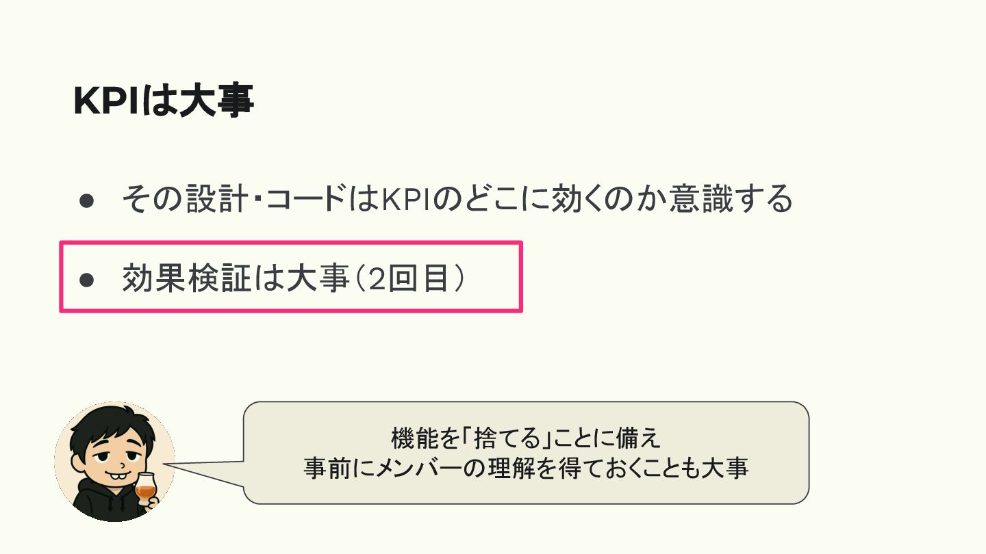 • その設計・コードはKPIのどこに効くのか意識する • 効果検証は大事(2回目) KPIは大事 機能を「捨てる」ことに備え 事前にメンバーの理解を得ておくことも大事