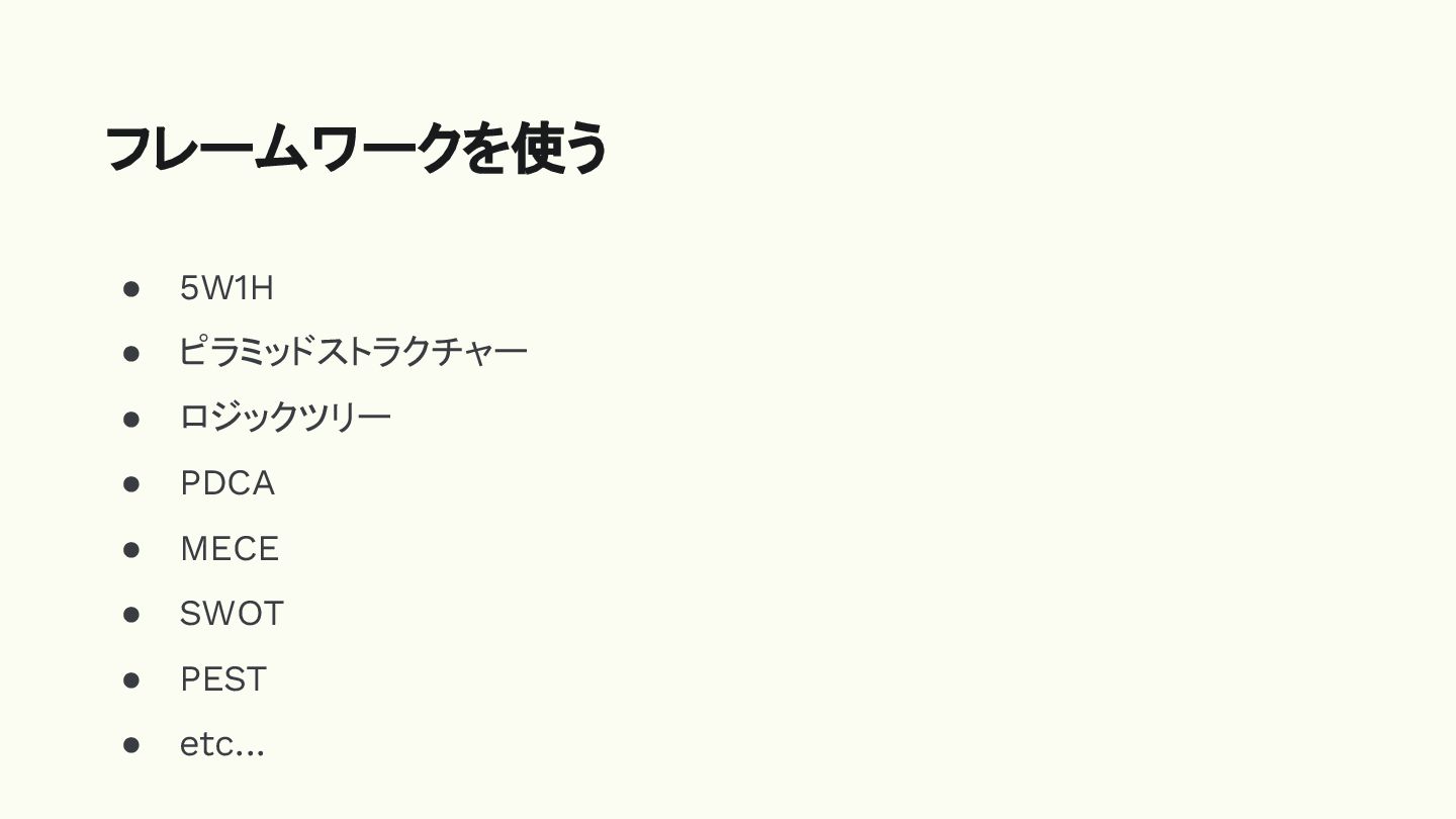 • 5W1H • ピラミッドストラクチャー • ロジックツリー • PDCA • MECE