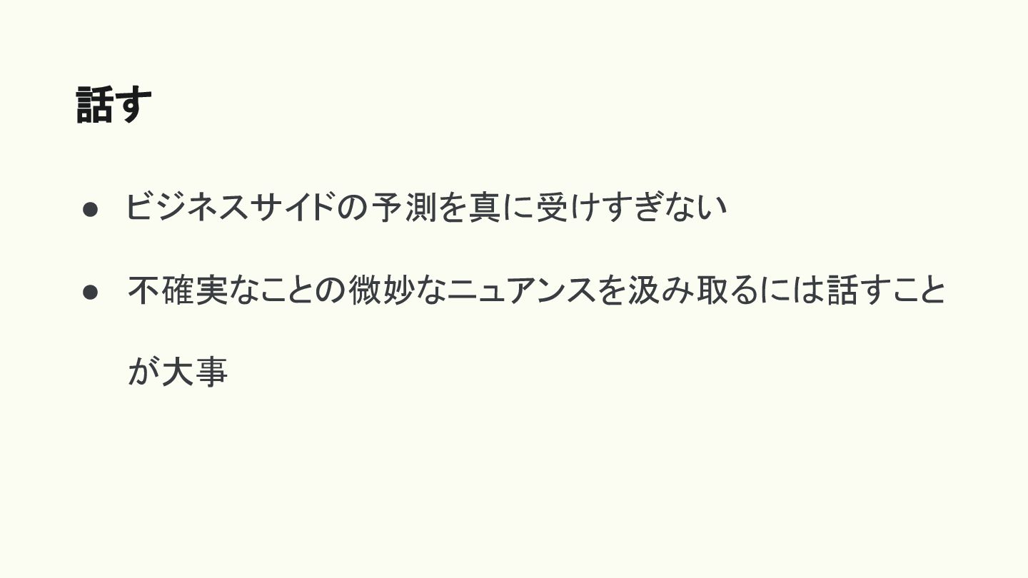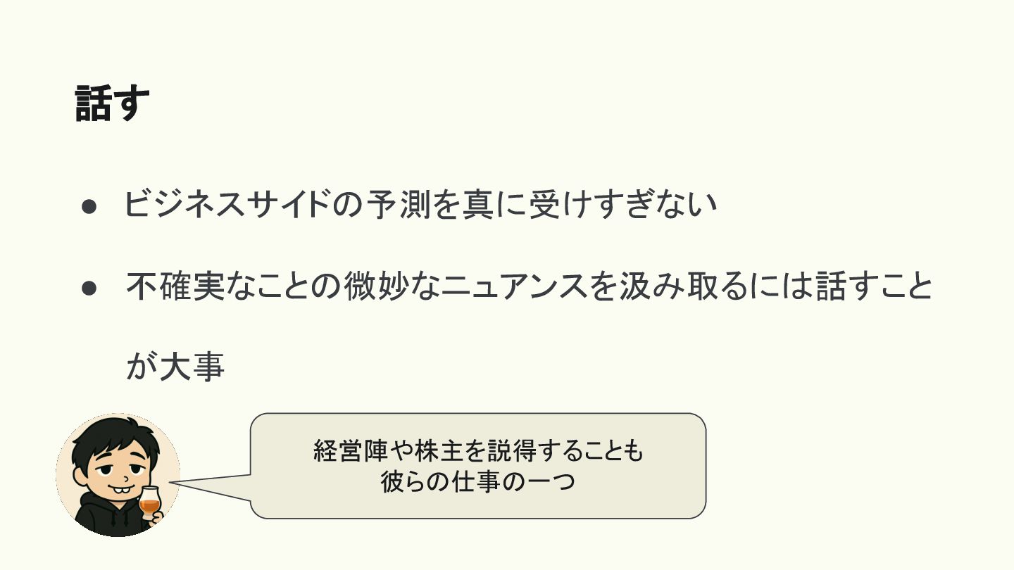 • ビジネスサイドの予測を真に受けすぎない • 不確実なことの微妙なニュアンスを汲み取るには話すこと が大事 話す 経営陣や株主を説得することも 彼らの仕事の一つ
