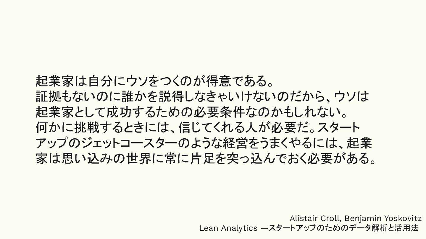 起業家は自分にウソをつくのが得意である。 証拠もないのに誰かを説得しなきゃいけないのだから、ウソは 起業家として成功するための必要条件なのかもしれない。 何かに挑戦するときには、信じてくれる人が必要だ。スタート アップのジェットコースターのような経営をうまくやるには、起業 家は思い込みの世界に常に片足を突っ込んでおく必要がある。 Alistair Croll, Benjamin Yoskovitz