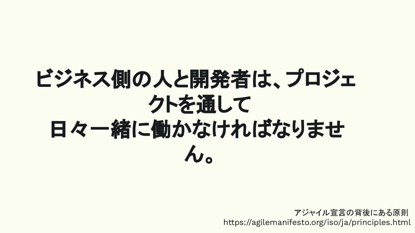 ビジネス側の人と開発者は、プロジェ クトを通して 日々一緒に働かなければなりませ ん。 アジャイル宣言の背後にある原則 https://agilemanifesto.org/iso/ja/principles.html