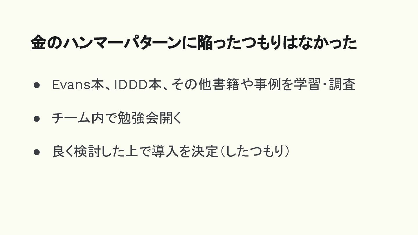 • Evans本、IDDD本、その他書籍や事例を学習・調査 • チーム内で勉強会開く • 良く検討した上で導入を決定(したつもり) 金のハンマーパターンに陥ったつもりはなかった