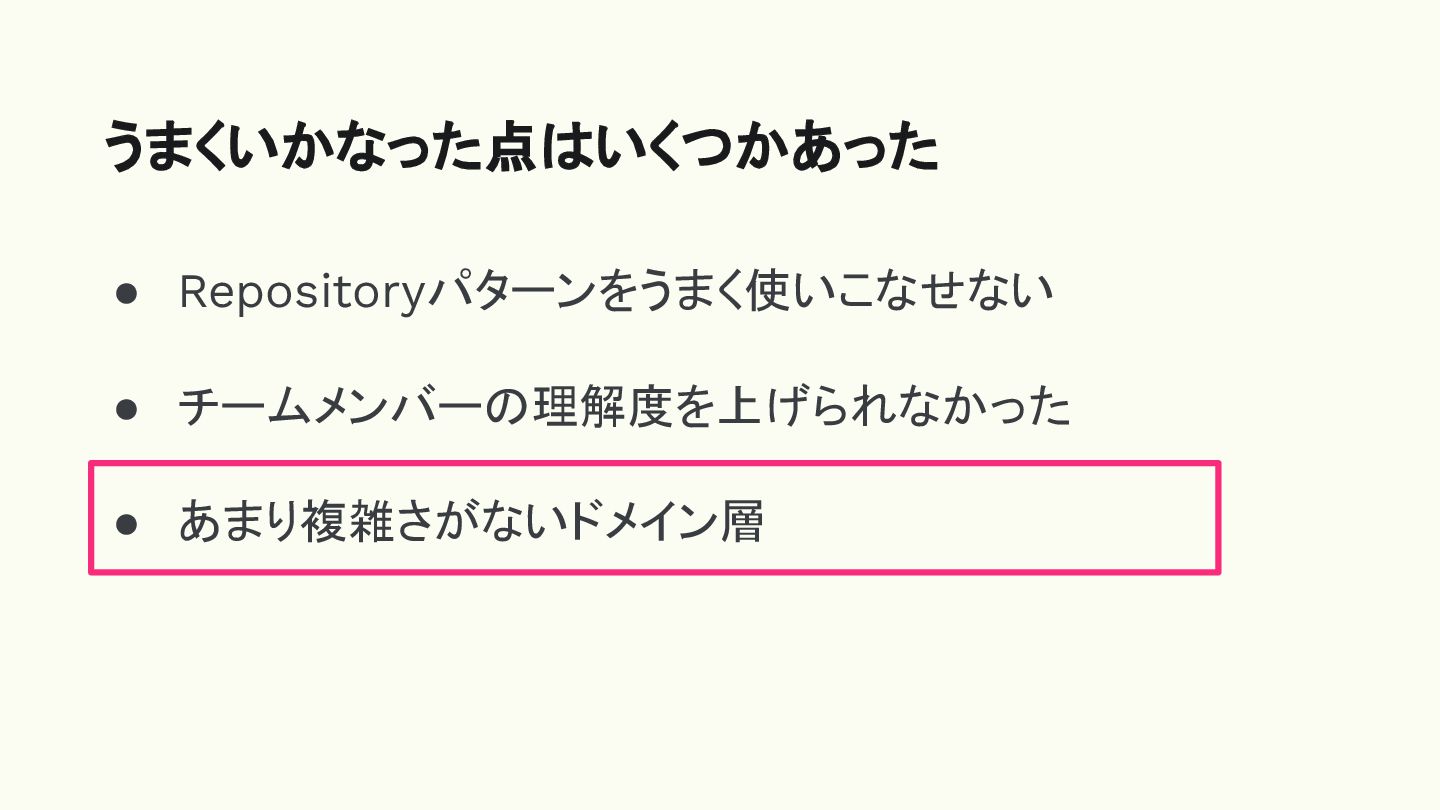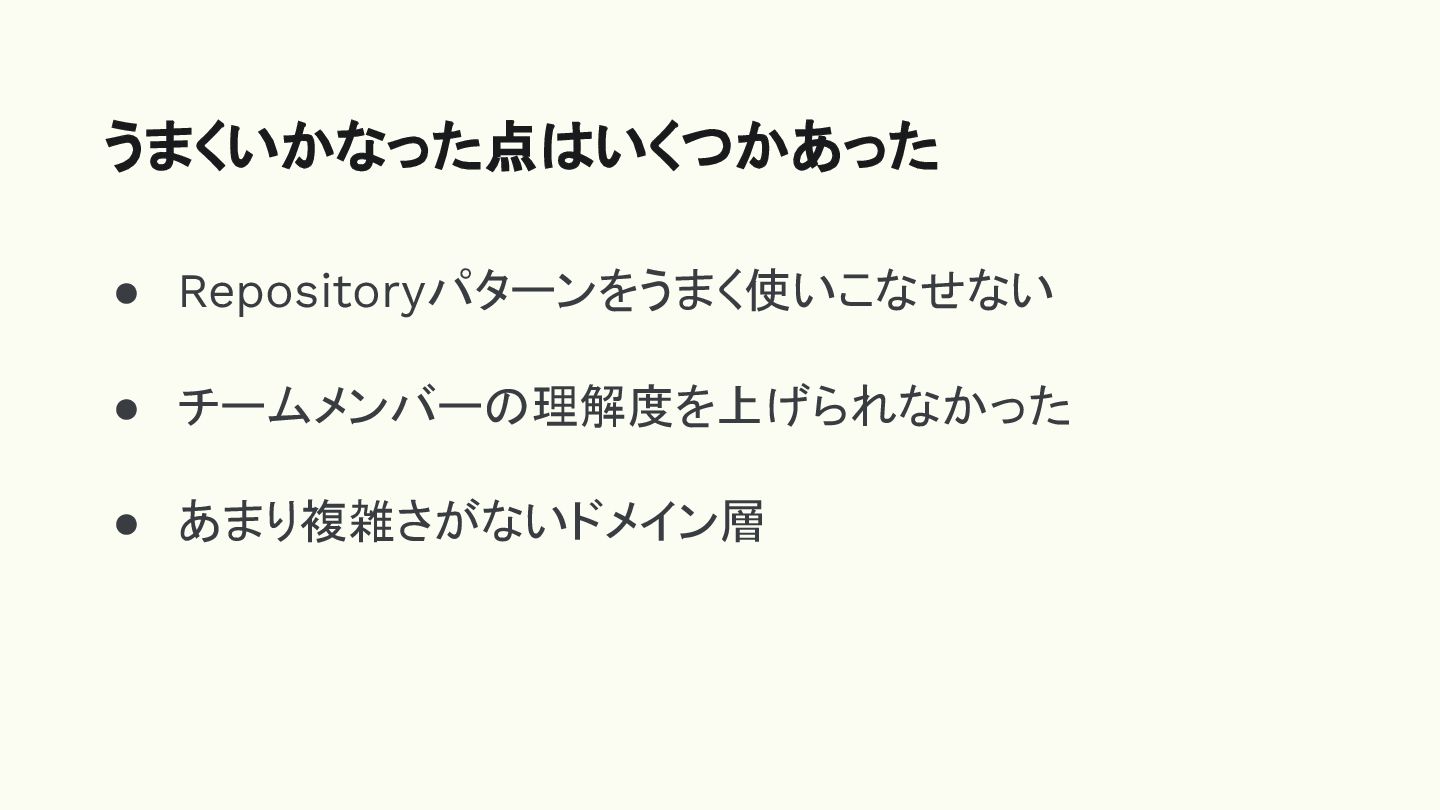 • Repositoryパターンをうまく使いこなせない • チームメンバーの理解度を上げられなかった • あまり複雑さがないドメイン層 うまくいかなった点はいくつかあった