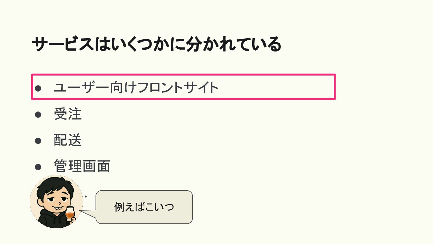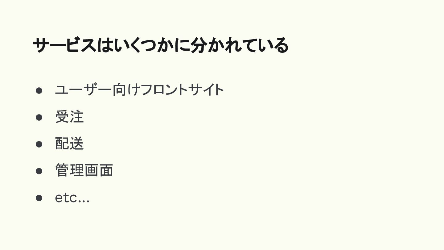 • ユーザー向けフロントサイト • 受注 • 配送 • 管理画面 • etc…