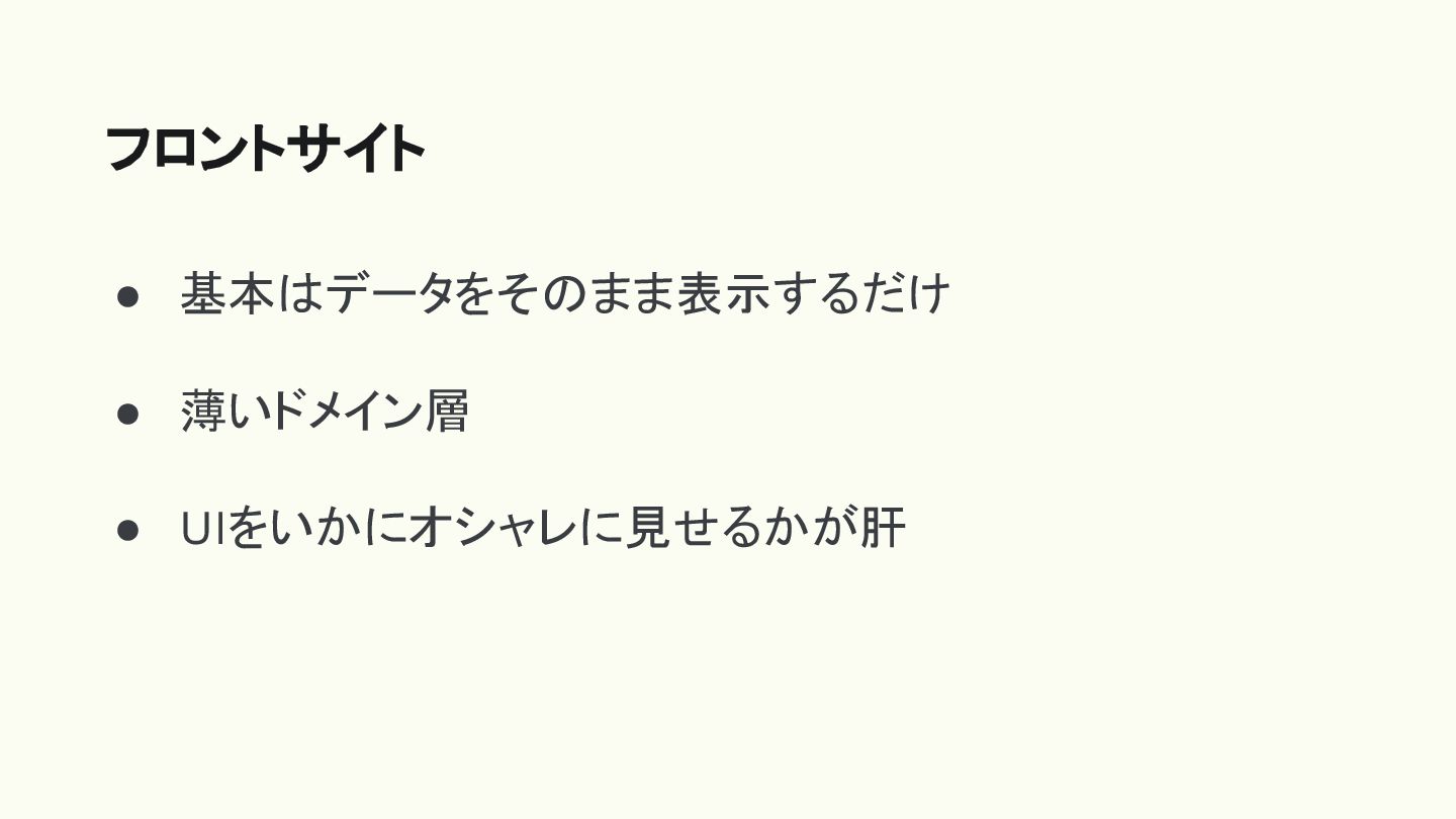 • 基本はデータをそのまま表示するだけ • 薄いドメイン層 • UIをいかにオシャレに見せるかが肝 フロントサイト