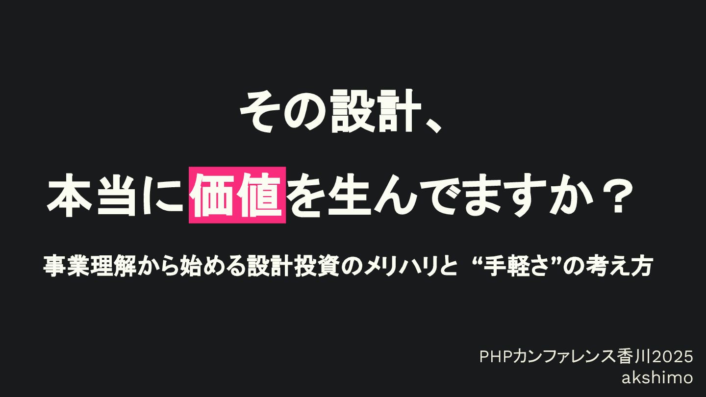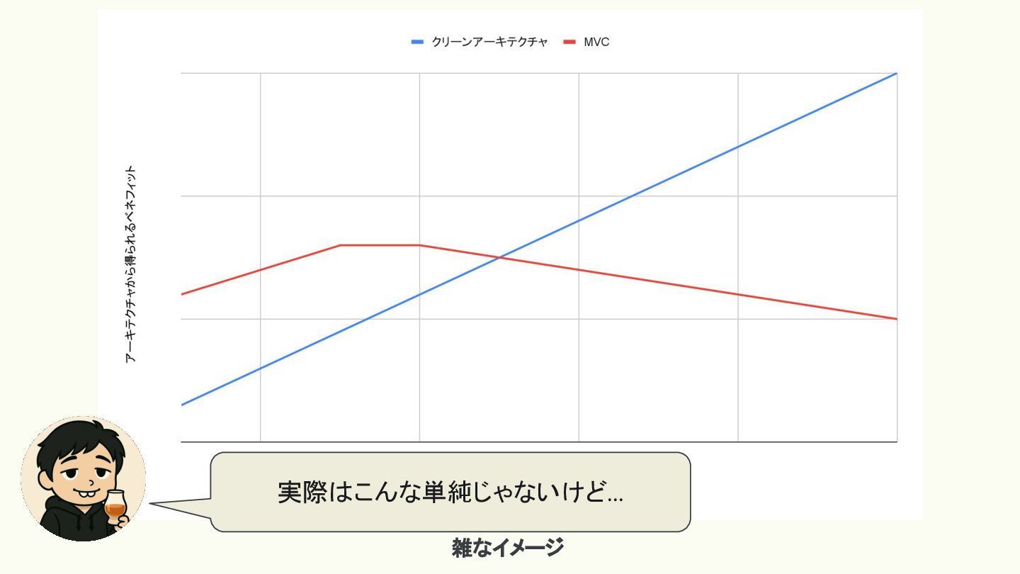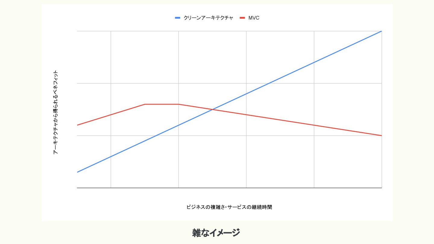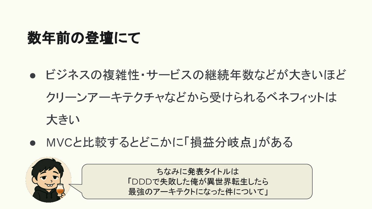 • ビジネスの複雑性・サービスの継続年数などが大きいほど クリーンアーキテクチャなどから受けられるベネフィットは 大きい • MVCと比較するとどこかに「損益分岐点」がある 数年前の登壇にて ちなみに発表タイトルは 「DDDで失敗した俺が異世界転生したら 最強のアーキテクトになった件について」