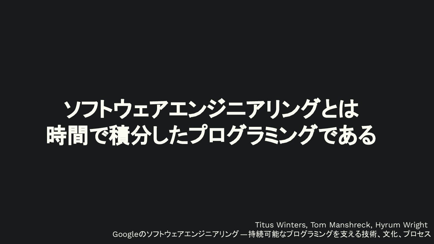 ソフトウェアエンジニアリングとは 時間で積分したプログラミングである Titus Winters, Tom Manshreck, Hyrum Wright Googleのソフトウェアエンジニアリング ―持続可能なプログラミングを支える技術、文化、プロセス