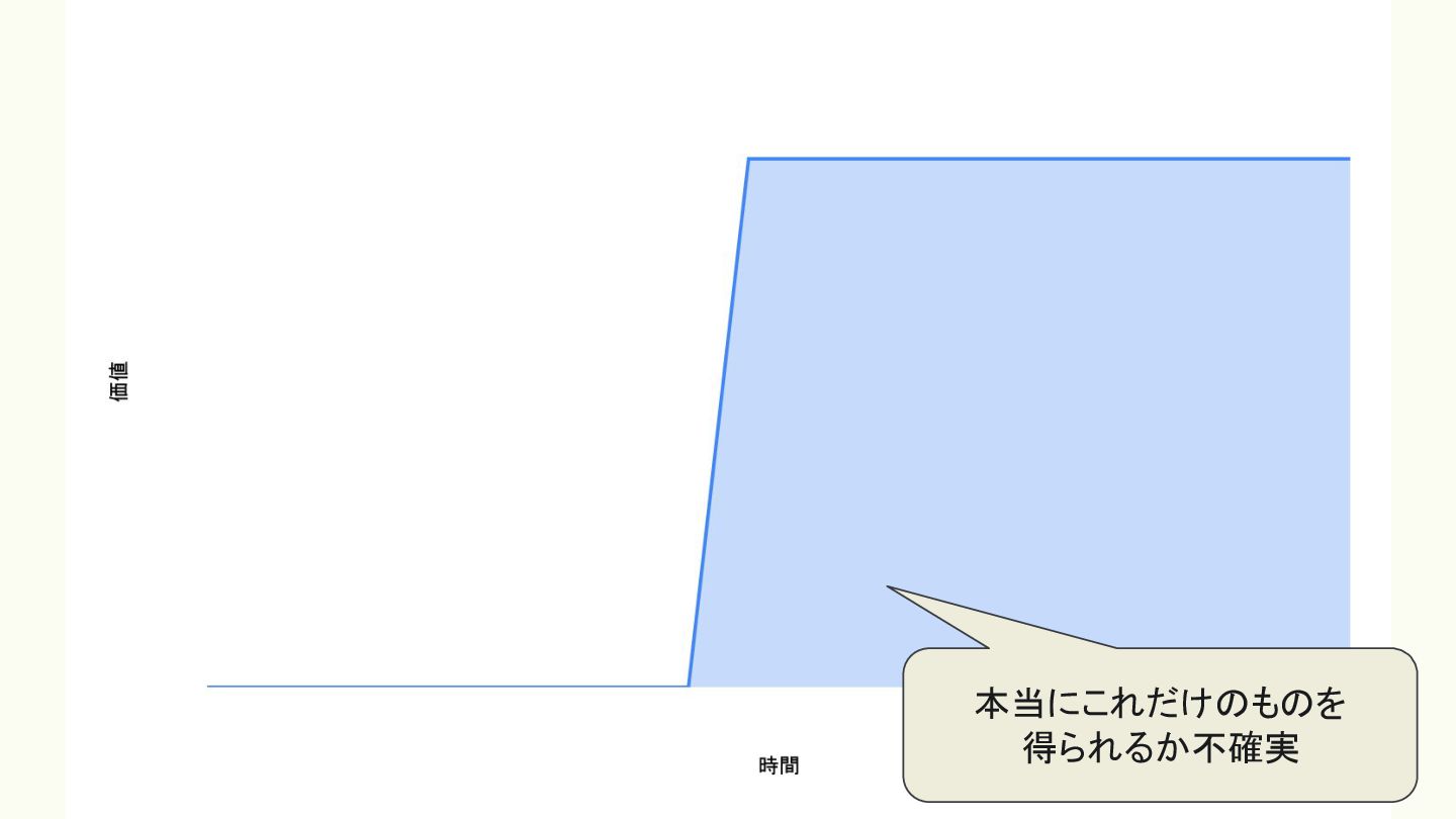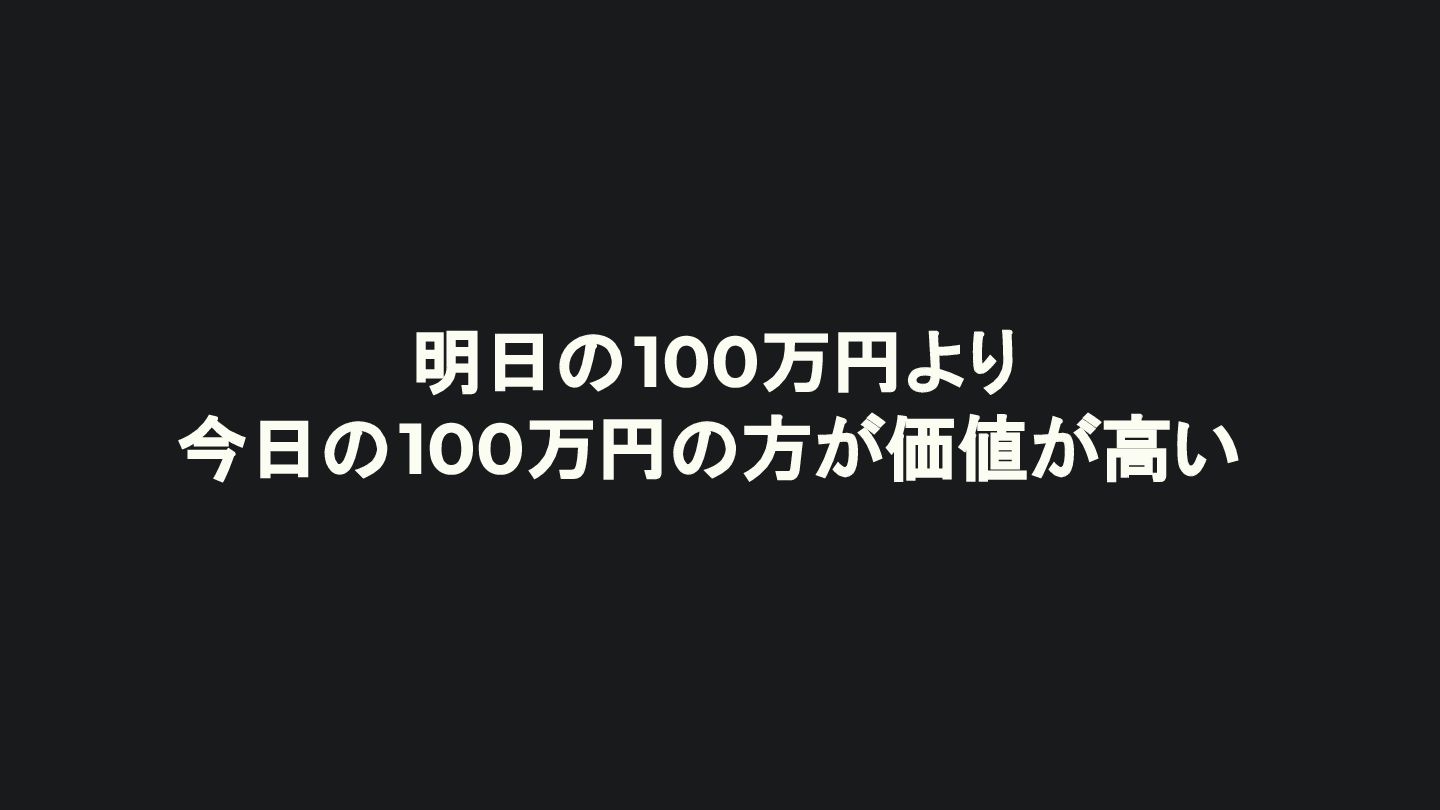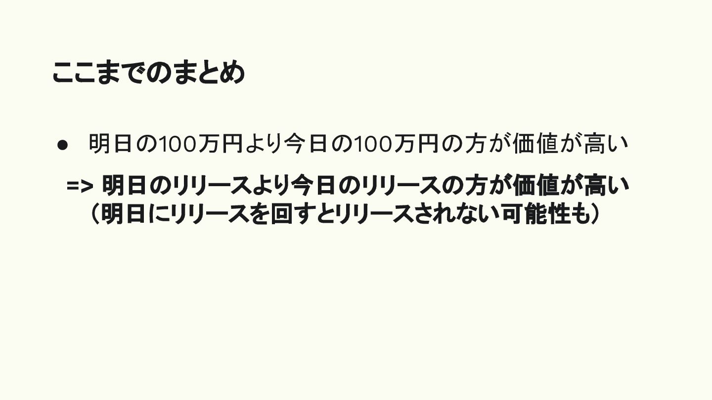 • 明日の100万円より今日の100万円の方が価値が高い ここまでのまとめ => 明日のリリースより今日のリリースの方が価値が高い (明日にリリースを回すとリリースされない可能性も)