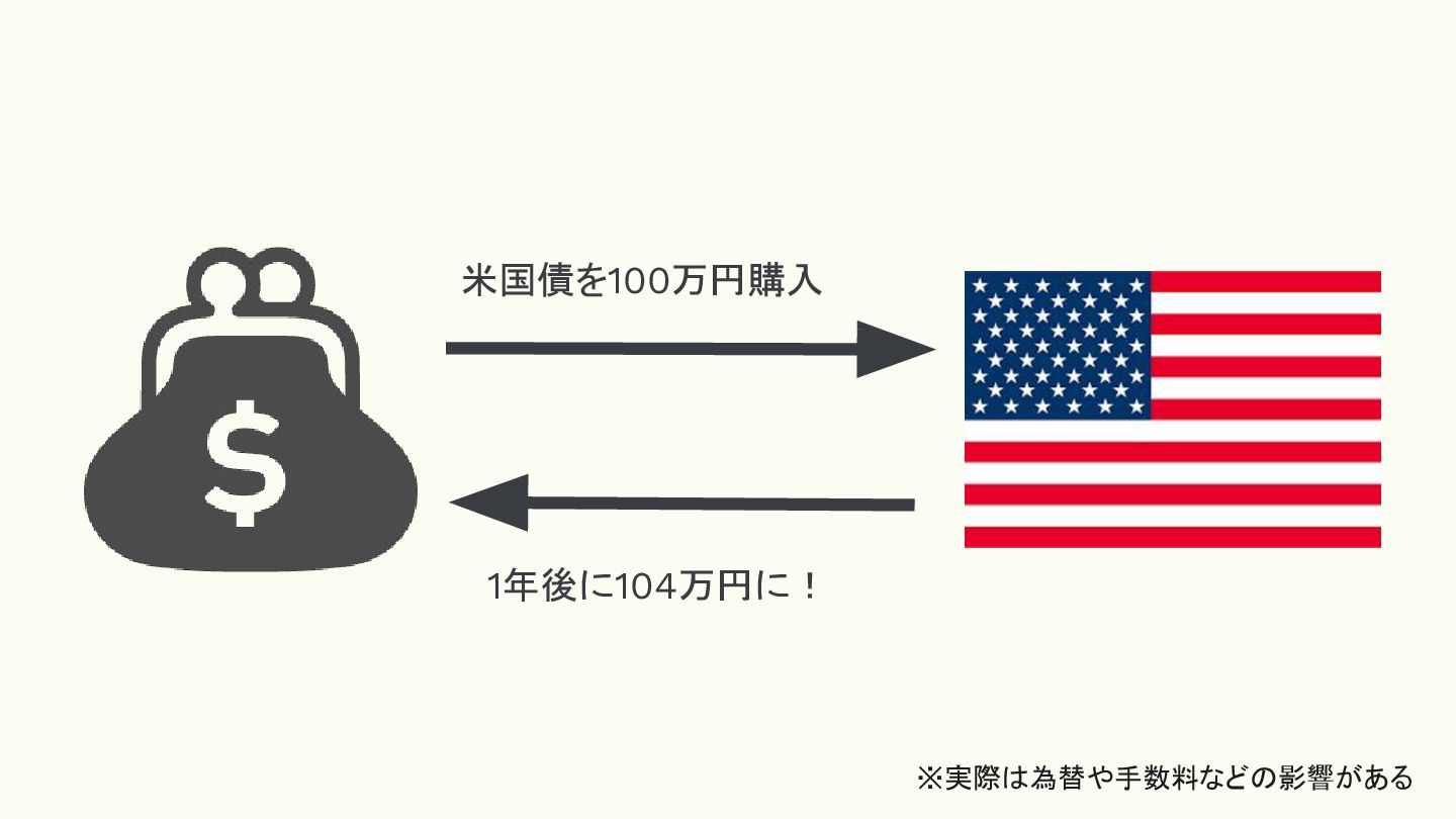 米国債を100万円購入 1年後に104万円に! ※実際は為替や手数料などの影響がある
