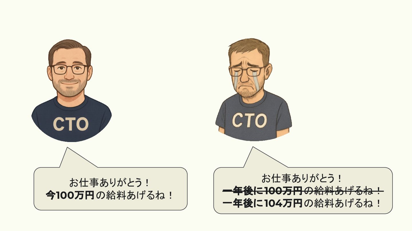 お仕事ありがとう! 今100万円の給料あげるね! お仕事ありがとう! 一年後に100万円の給料あげるね! 一年後に104万円の給料あげるね!