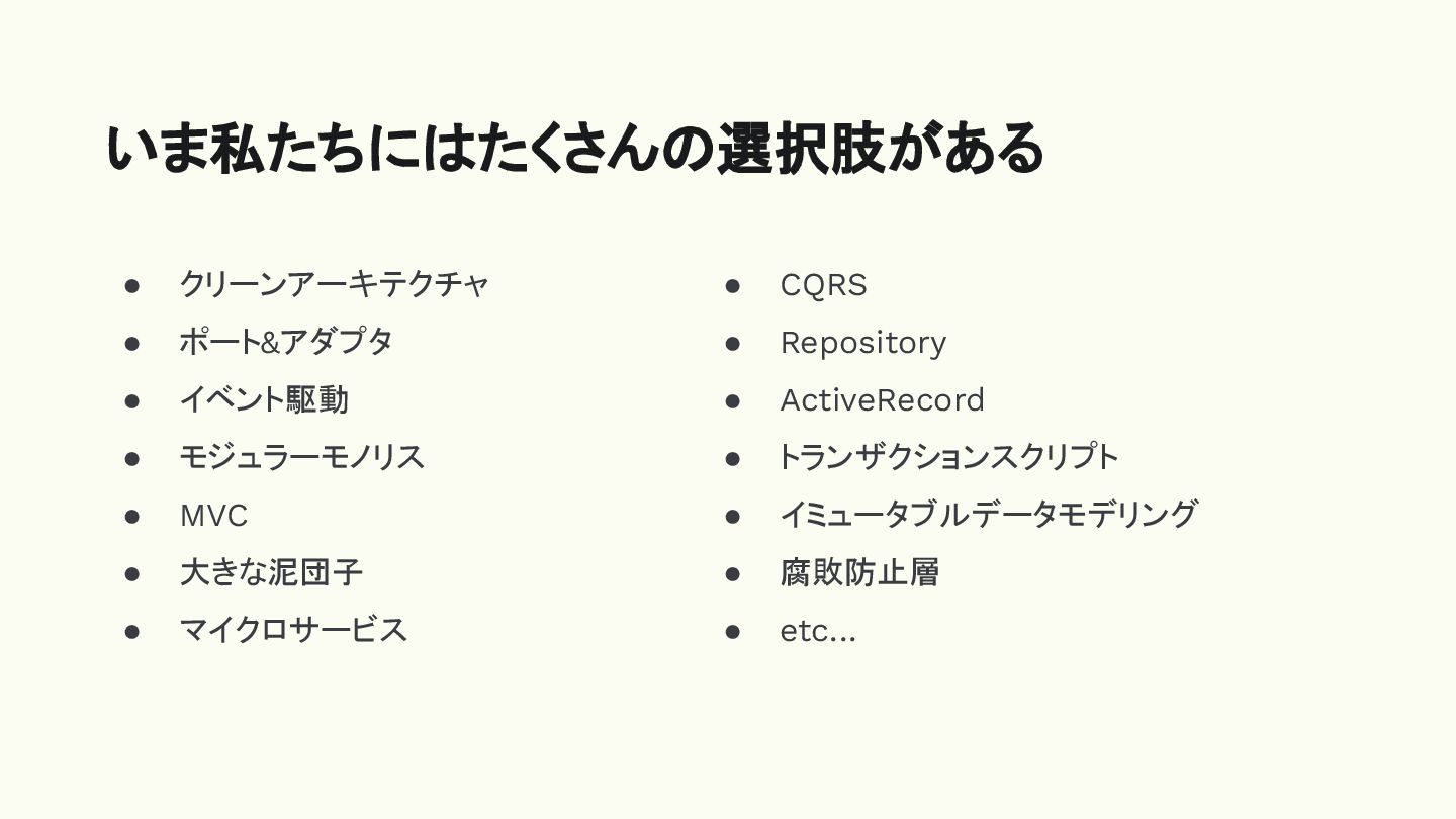 • 大きな泥団子 • マイクロサービス いま私たちにはたくさんの選択肢がある • CQRS • Repository • ActiveRecord • トランザクションスクリプト • イミュータブルデータモデリング • 腐敗防止層 • etc…