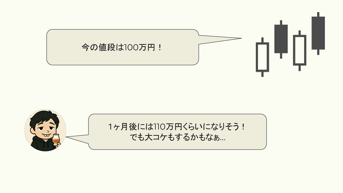 今の値段は100万円! 1ヶ月後には110万円くらいになりそう! でも大コケもするかもなぁ…