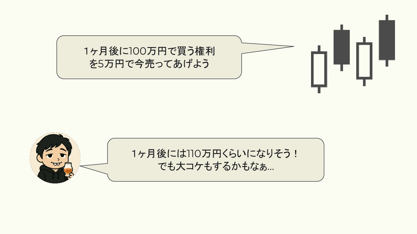 1ヶ月後に100万円で買う権利 を5万円で今売ってあげよう 1ヶ月後には110万円くらいになりそう! でも大コケもするかもなぁ…