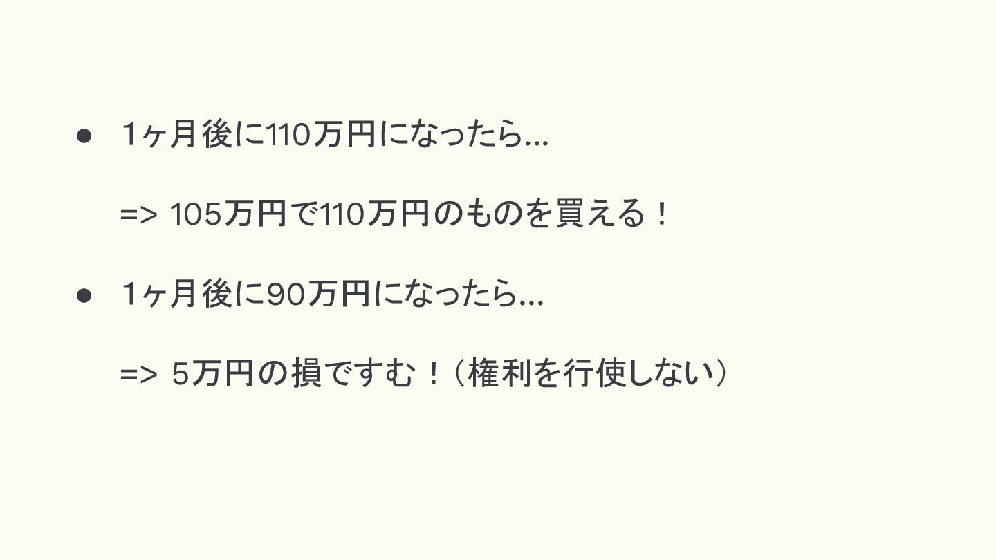 • 1ヶ月後に110万円になったら... => 105万円で110万円のものを買える! • 1ヶ月後に90万円になったら... => 5万円の損ですむ!(権利を行使しない)