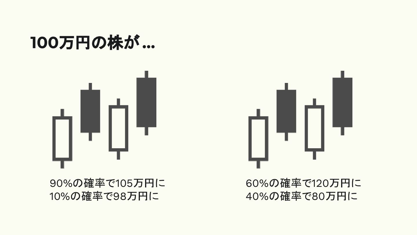 90%の確率で105万円に 10%の確率で98万円に 100万円の株が … 60%の確率で120万円に 40%の確率で80万円に