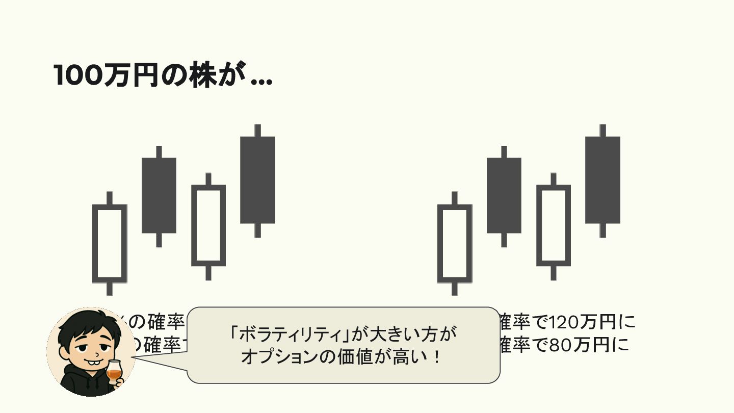 90%の確率で105万円に 10%の確率で98万円に 100万円の株が … 60%の確率で120万円に 40%の確率で80万円に 「ボラティリティ」が大きい方が オプションの価値が高い!