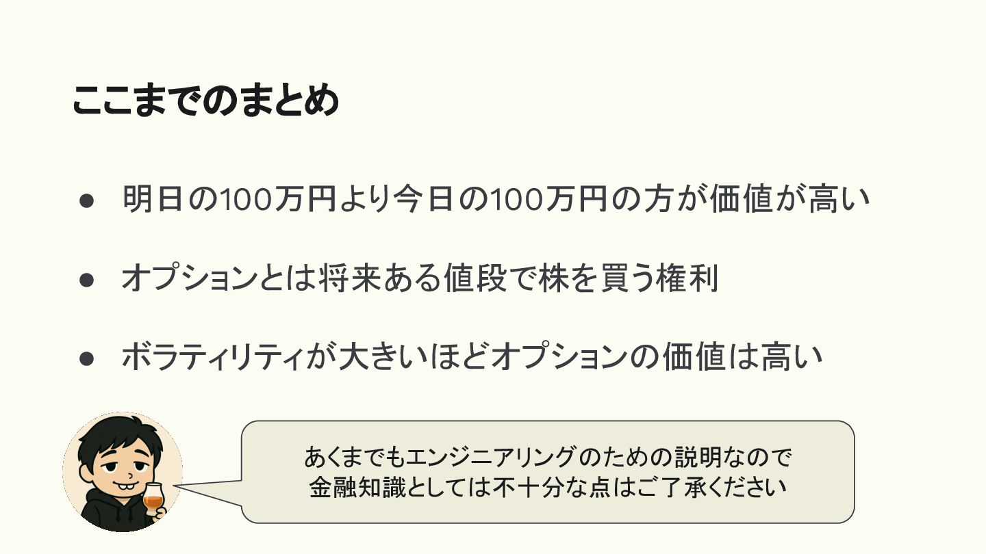 • 明日の100万円より今日の100万円の方が価値が高い • オプションとは将来ある値段で株を買う権利 • ボラティリティが大きいほどオプションの価値は高い ここまでのまとめ あくまでもエンジニアリングのための説明なので 金融知識としては不十分な点はご了承ください