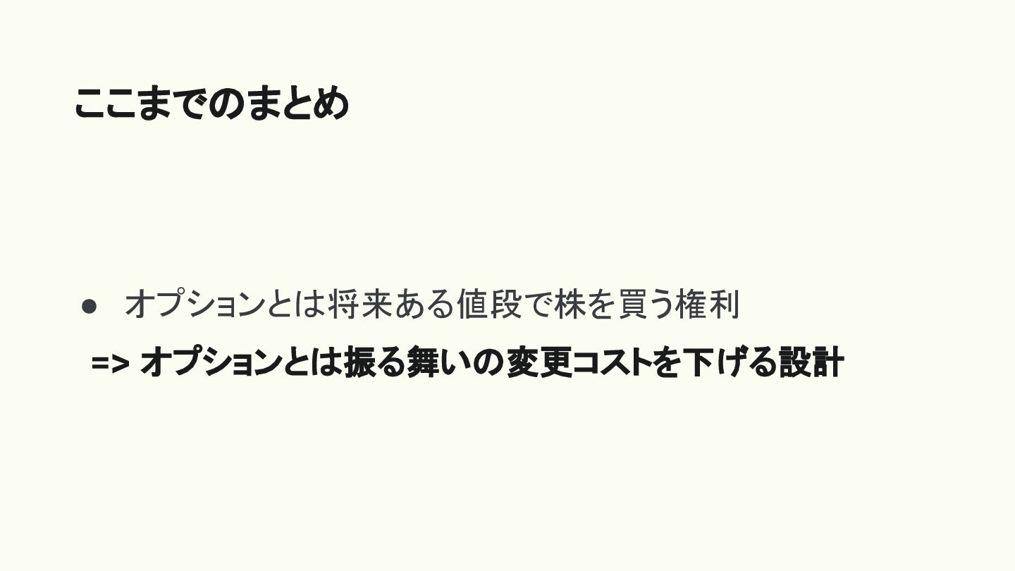 • オプションとは将来ある値段で株を買う権利 ここまでのまとめ => オプションとは振る舞いの変更コストを下げる設計