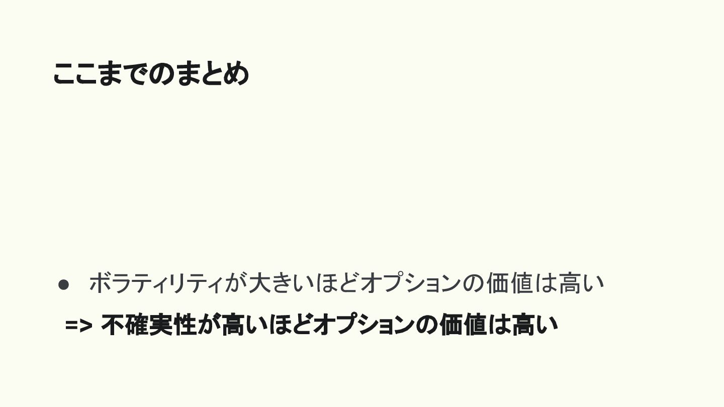 • ボラティリティが大きいほどオプションの価値は高い ここまでのまとめ => 不確実性が高いほどオプションの価値は高い