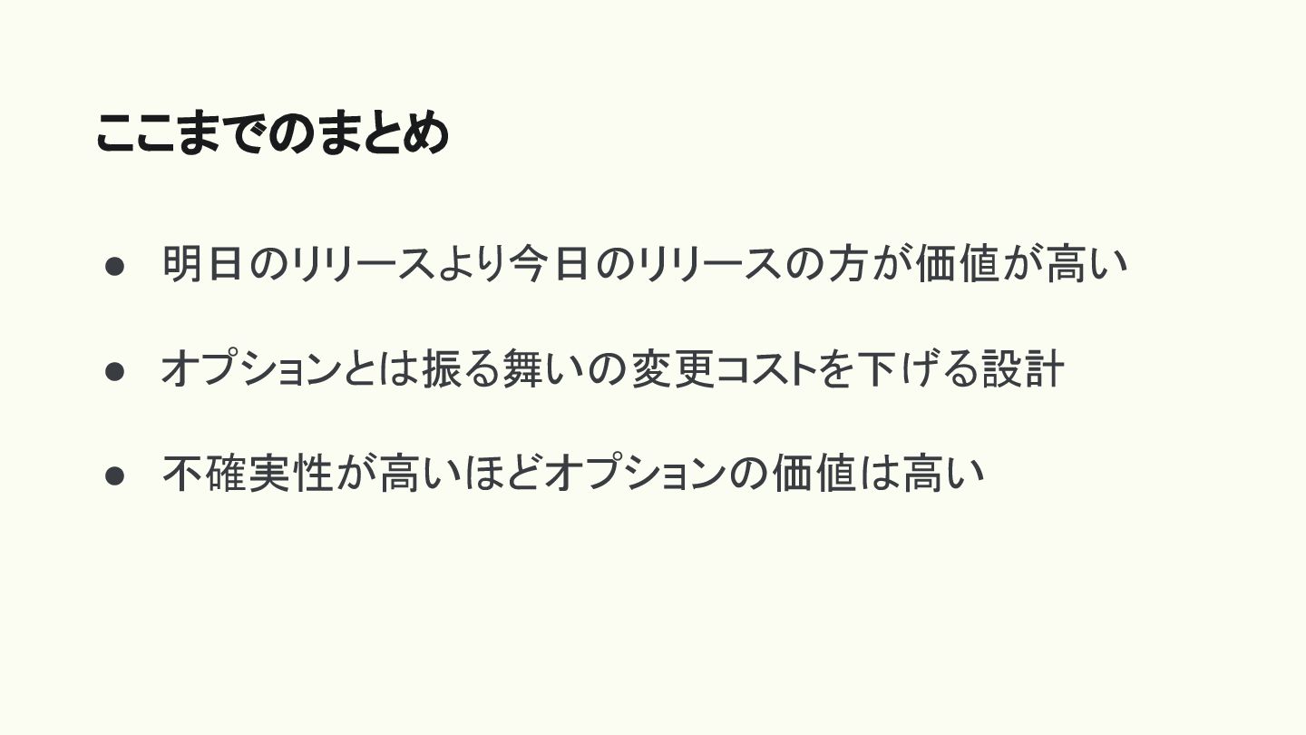 • 明日のリリースより今日のリリースの方が価値が高い • オプションとは振る舞いの変更コストを下げる設計 • 不確実性が高いほどオプションの価値は高い ここまでのまとめ