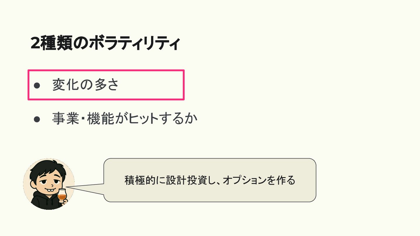 • 変化の多さ • 事業・機能がヒットするか 2種類のボラティリティ 積極的に設計投資し、オプションを作る