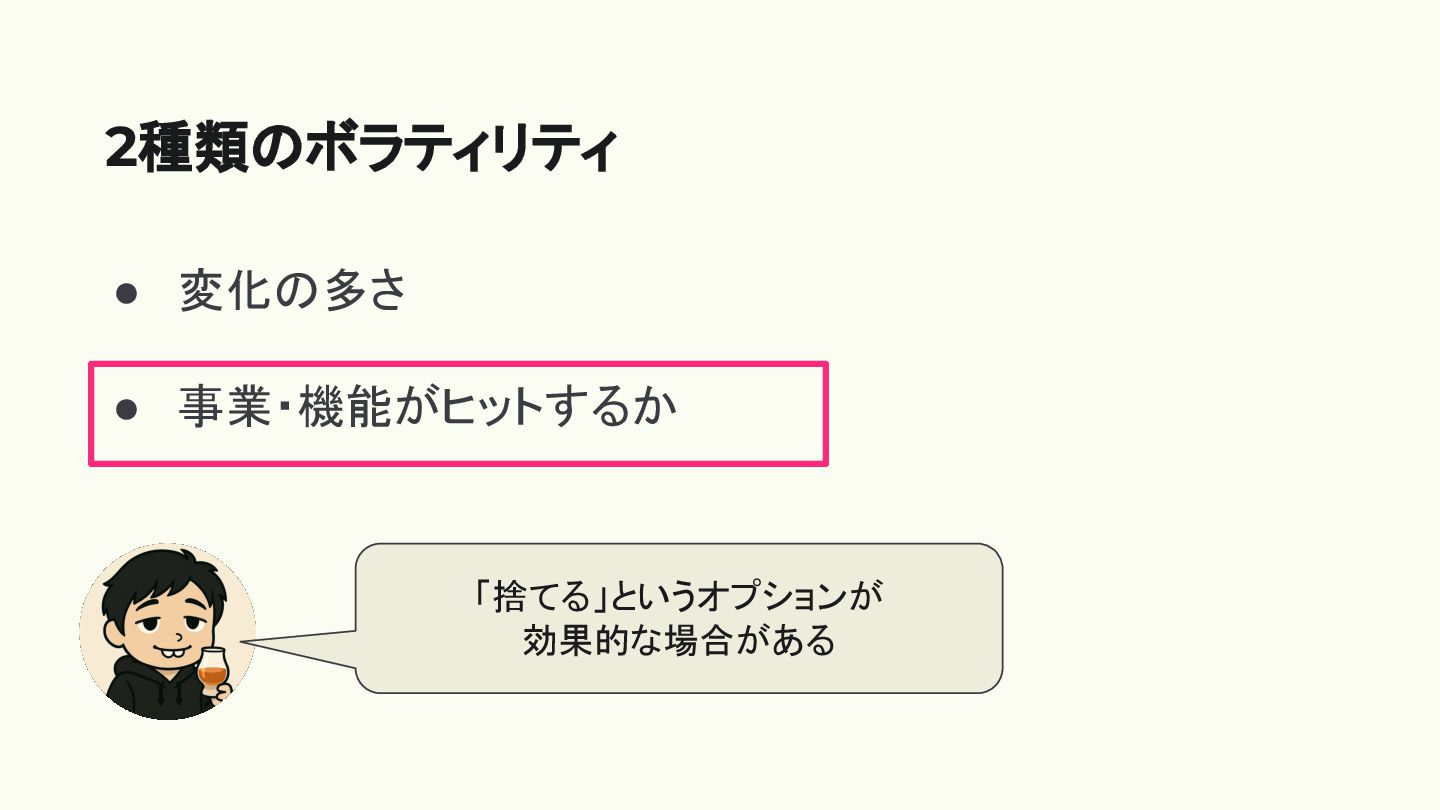 • 変化の多さ • 事業・機能がヒットするか 2種類のボラティリティ 「捨てる」というオプションが 効果的な場合がある
