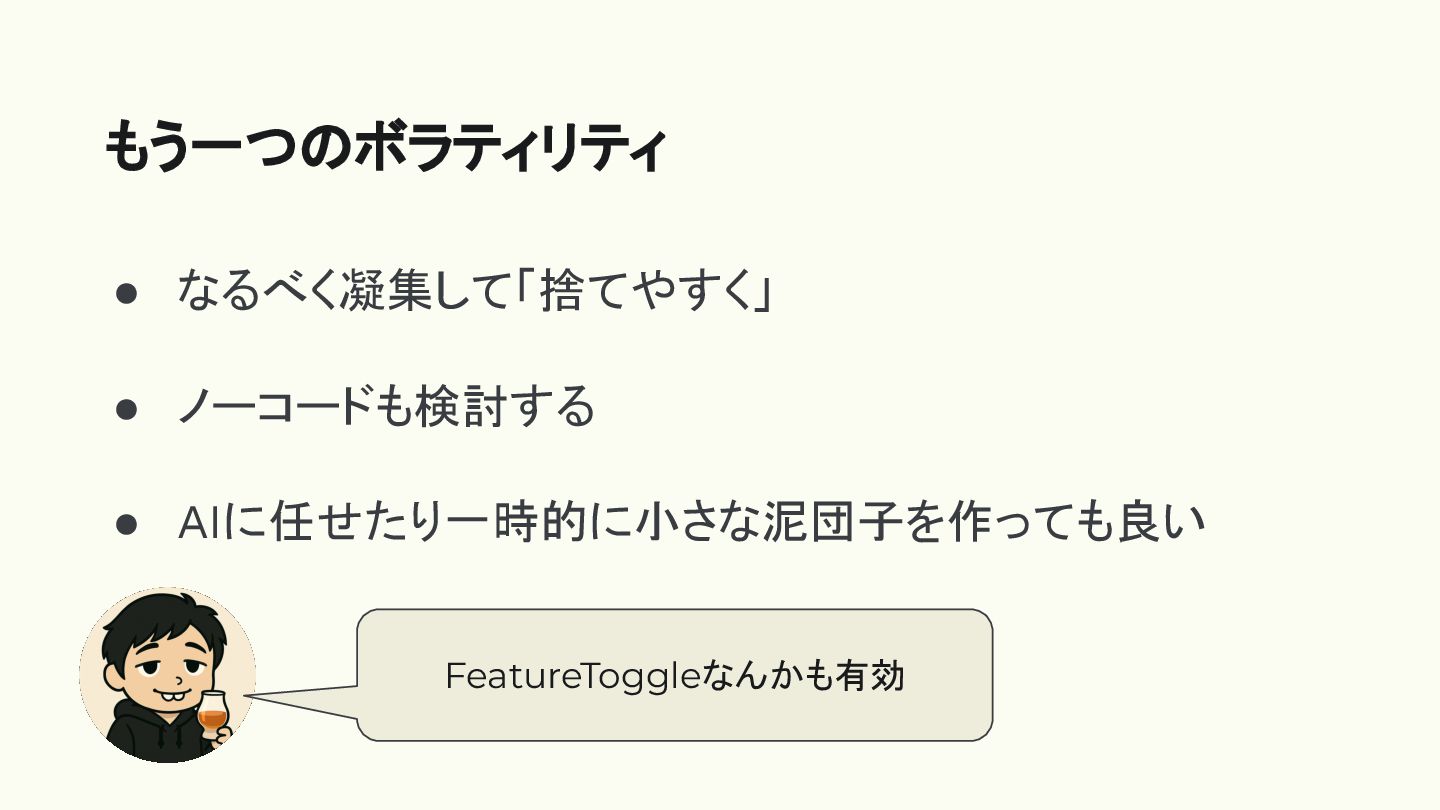 • なるべく凝集して「捨てやすく」 • ノーコードも検討する • AIに任せたり一時的に小さな泥団子を作っても良い もう一つのボラティリティ FeatureToggleなんかも有効