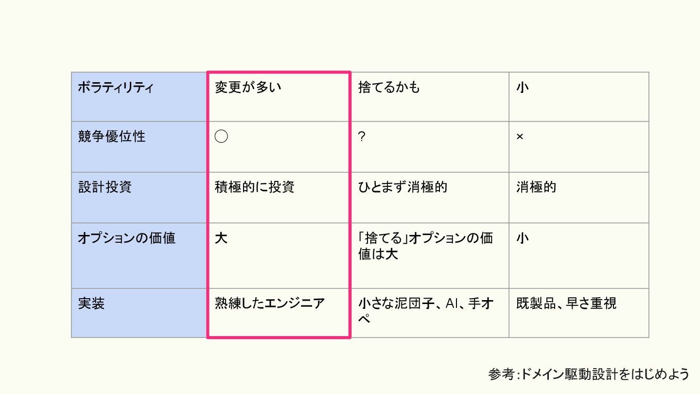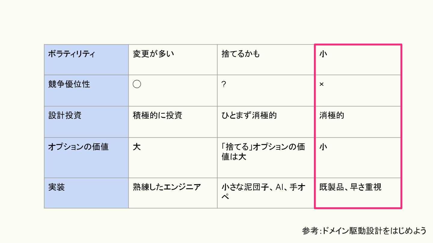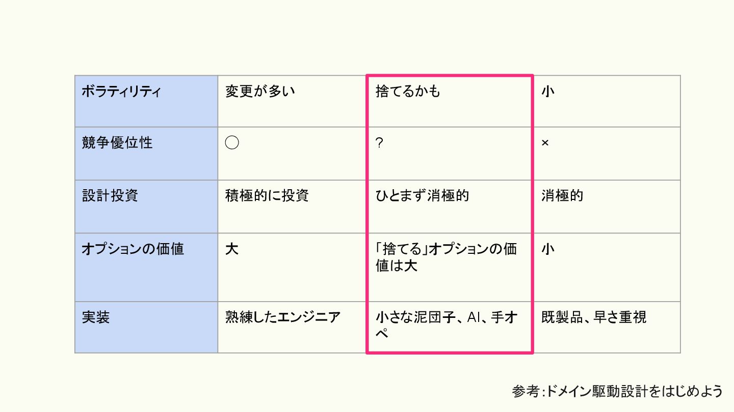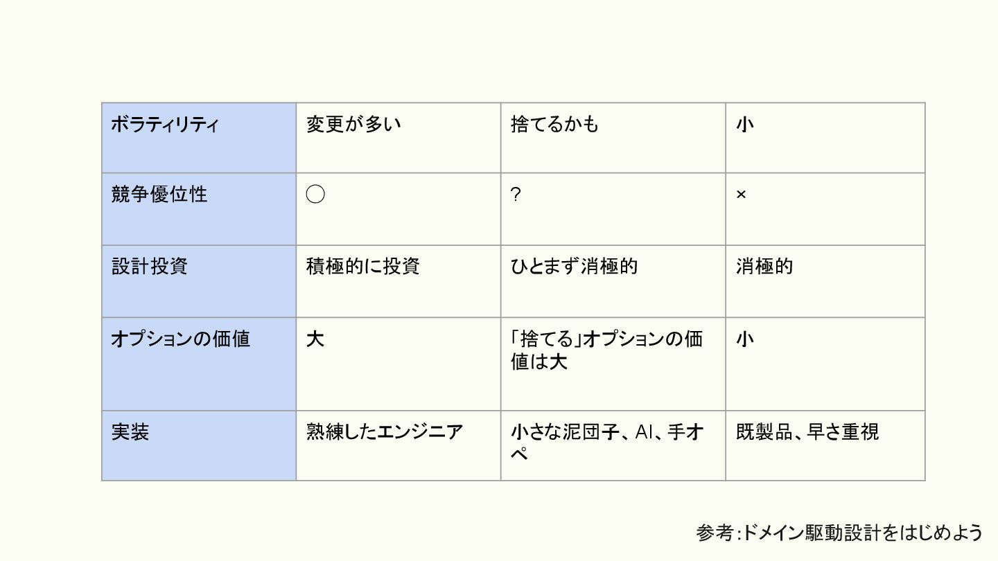 ひとまず消極的 消極的 オプションの価値 大 「捨てる」オプションの価 値は大 小 実装 熟練したエンジニア 小さな泥団子、AI、手オ ペ 既製品、早さ重視 参考:ドメイン駆動設計をはじめよう