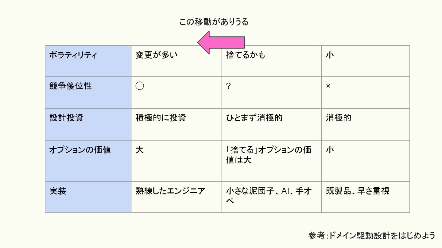 ひとまず消極的 消極的 オプションの価値 大 「捨てる」オプションの価 値は大 小 実装 熟練したエンジニア 小さな泥団子、AI、手オ ペ 既製品、早さ重視 参考:ドメイン駆動設計をはじめよう この移動がありうる