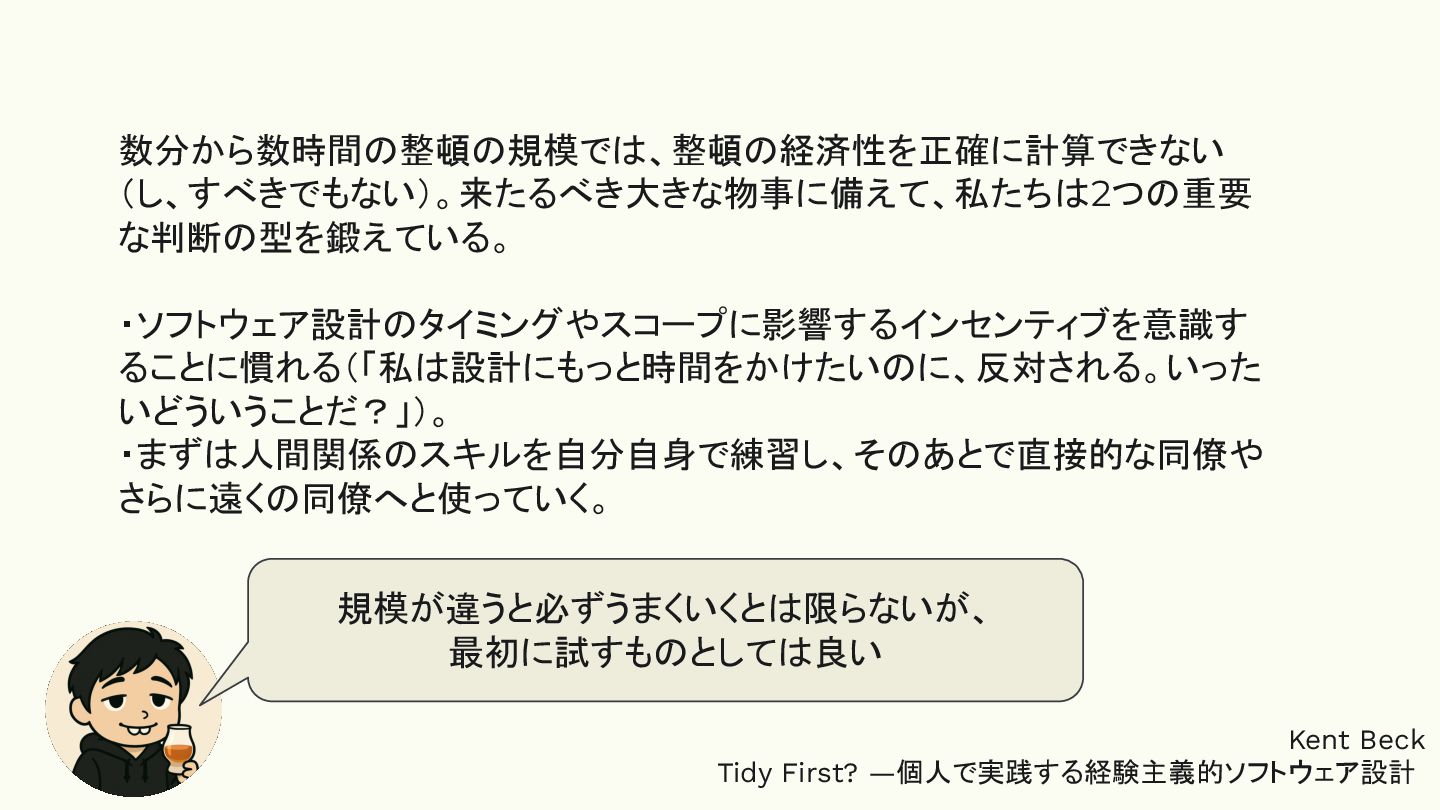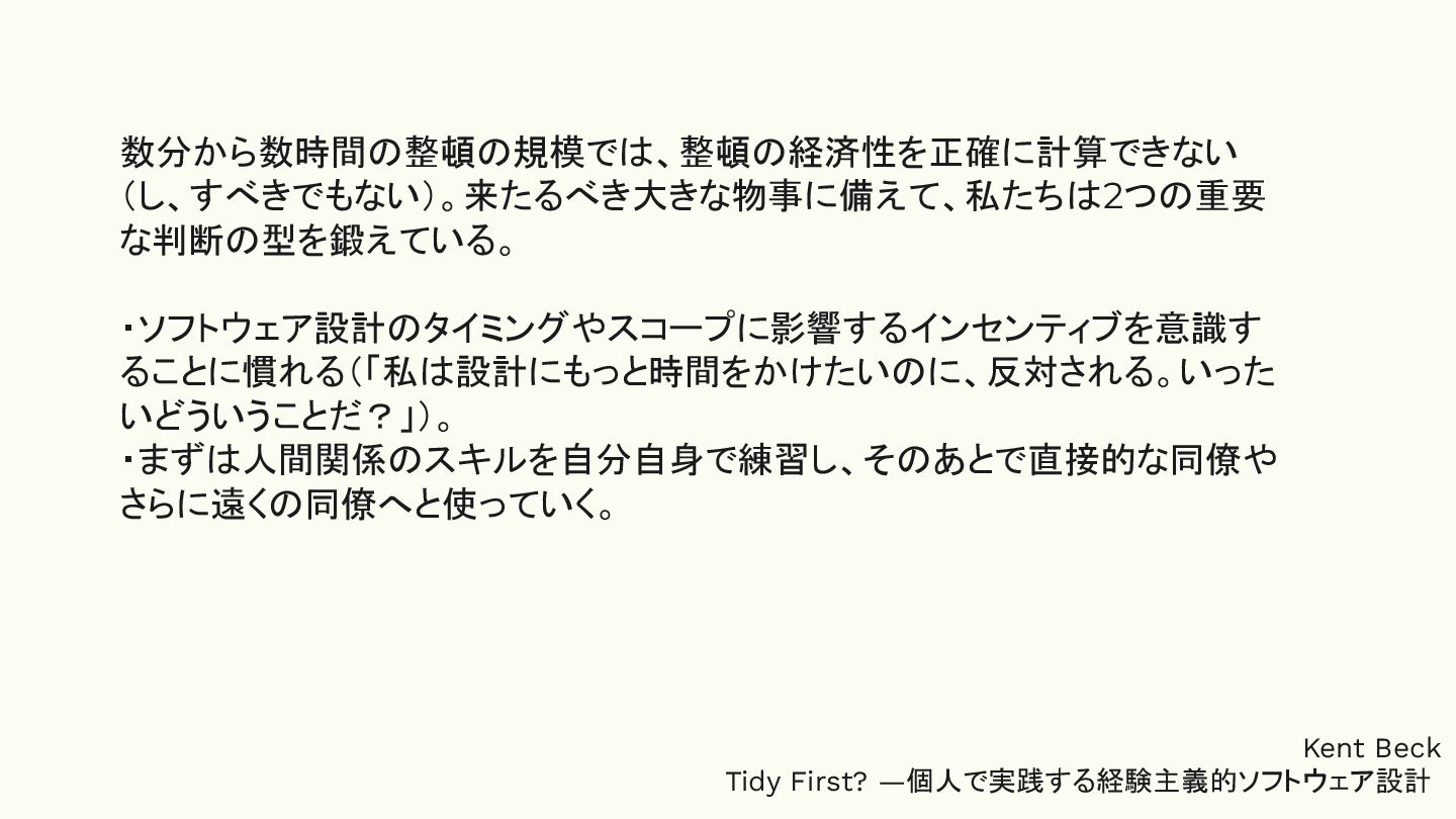 数分から数時間の整頓の規模では、整頓の経済性を正確に計算できない (し、すべきでもない)。来たるべき大きな物事に備えて、私たちは2つの重要 な判断の型を鍛えている。 ・ソフトウェア設計のタイミングやスコープに影響するインセンティブを意識す ることに慣れる(「私は設計にもっと時間をかけたいのに、反対される。いった いどういうことだ?」)。 ・まずは人間関係のスキルを自分自身で練習し、そのあとで直接的な同僚や さらに遠くの同僚へと使っていく。 Kent Beck