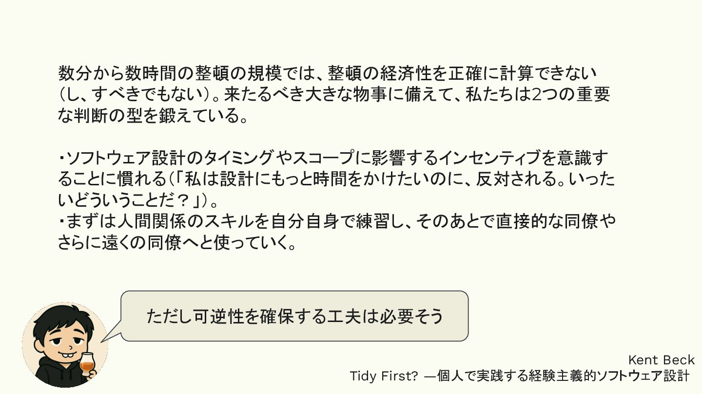 数分から数時間の整頓の規模では、整頓の経済性を正確に計算できない (し、すべきでもない)。来たるべき大きな物事に備えて、私たちは2つの重要 な判断の型を鍛えている。 ・ソフトウェア設計のタイミングやスコープに影響するインセンティブを意識す ることに慣れる(「私は設計にもっと時間をかけたいのに、反対される。いった いどういうことだ?」)。 ・まずは人間関係のスキルを自分自身で練習し、そのあとで直接的な同僚や さらに遠くの同僚へと使っていく。 ただし可逆性を確保する工夫は必要そう Kent