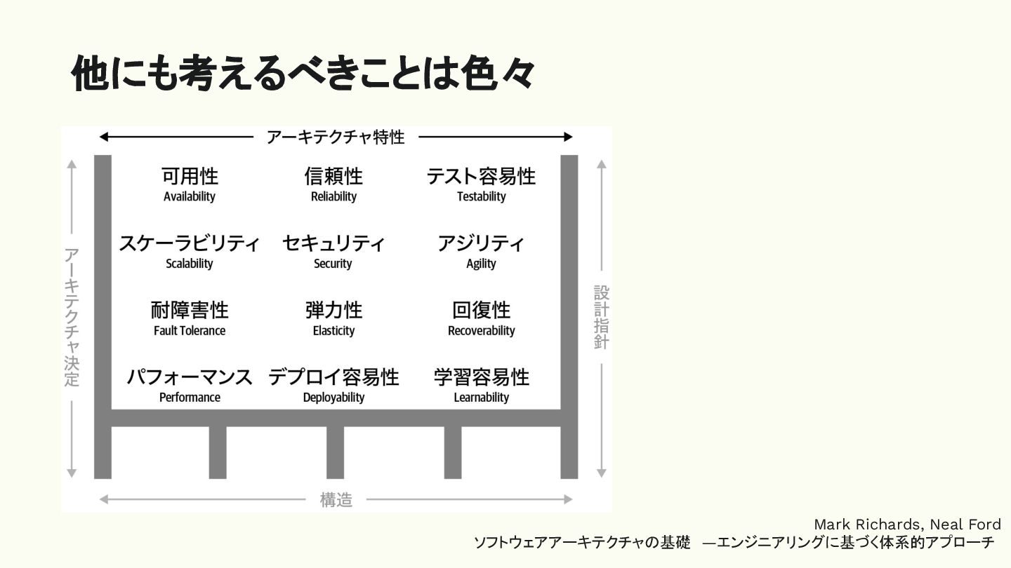 他にも考えるべきことは色々 Mark Richards, Neal Ford ソフトウェアアーキテクチャの基礎 ―エンジニアリングに基づく体系的アプローチ