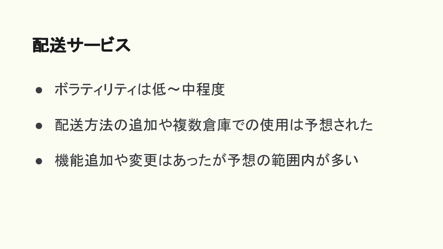 • ボラティリティは低〜中程度 • 配送方法の追加や複数倉庫での使用は予想された • 機能追加や変更はあったが予想の範囲内が多い 配送サービス