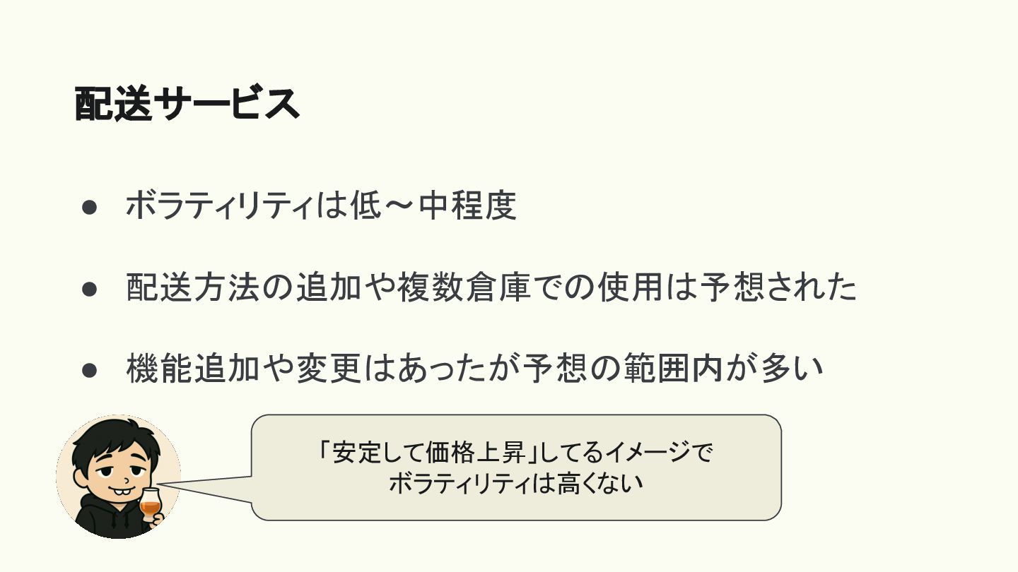 • ボラティリティは低〜中程度 • 配送方法の追加や複数倉庫での使用は予想された • 機能追加や変更はあったが予想の範囲内が多い 配送サービス 「安定して価格上昇」してるイメージで ボラティリティは高くない