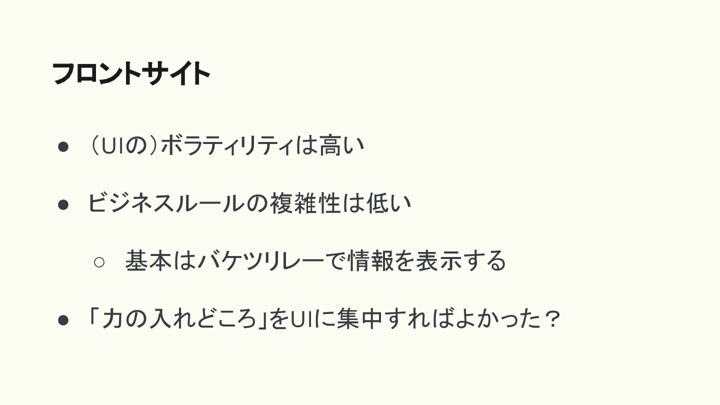 • (UIの)ボラティリティは高い • ビジネスルールの複雑性は低い ◦ 基本はバケツリレーで情報を表示する • 「力の入れどころ」をUIに集中すればよかった? フロントサイト
