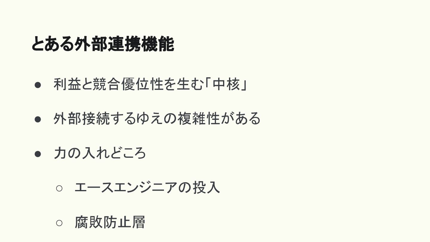 • 利益と競合優位性を生む「中核」 • 外部接続するゆえの複雑性がある • 力の入れどころ ◦ エースエンジニアの投入 ◦ 腐敗防止層