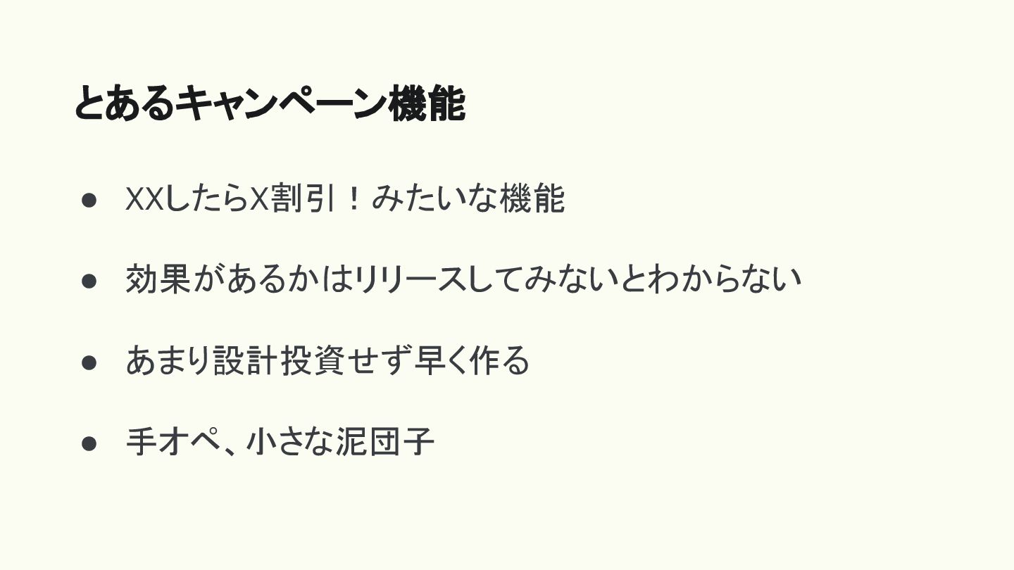 • XXしたらX割引!みたいな機能 • 効果があるかはリリースしてみないとわからない • あまり設計投資せず早く作る • 手オペ、小さな泥団子 とあるキャンペーン機能