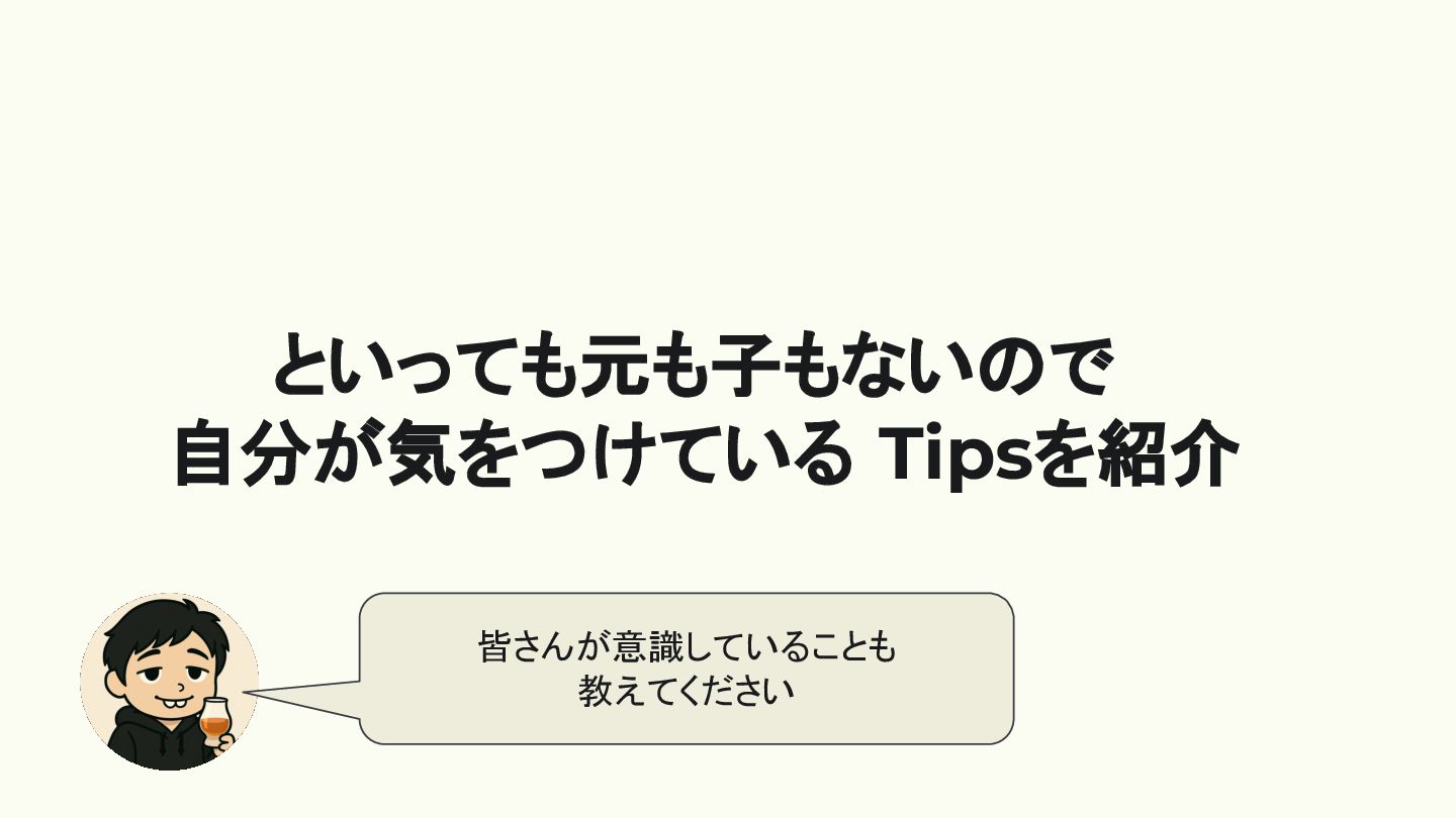 といっても元も子もないので 自分が気をつけている Tipsを紹介 皆さんが意識していることも 教えてください