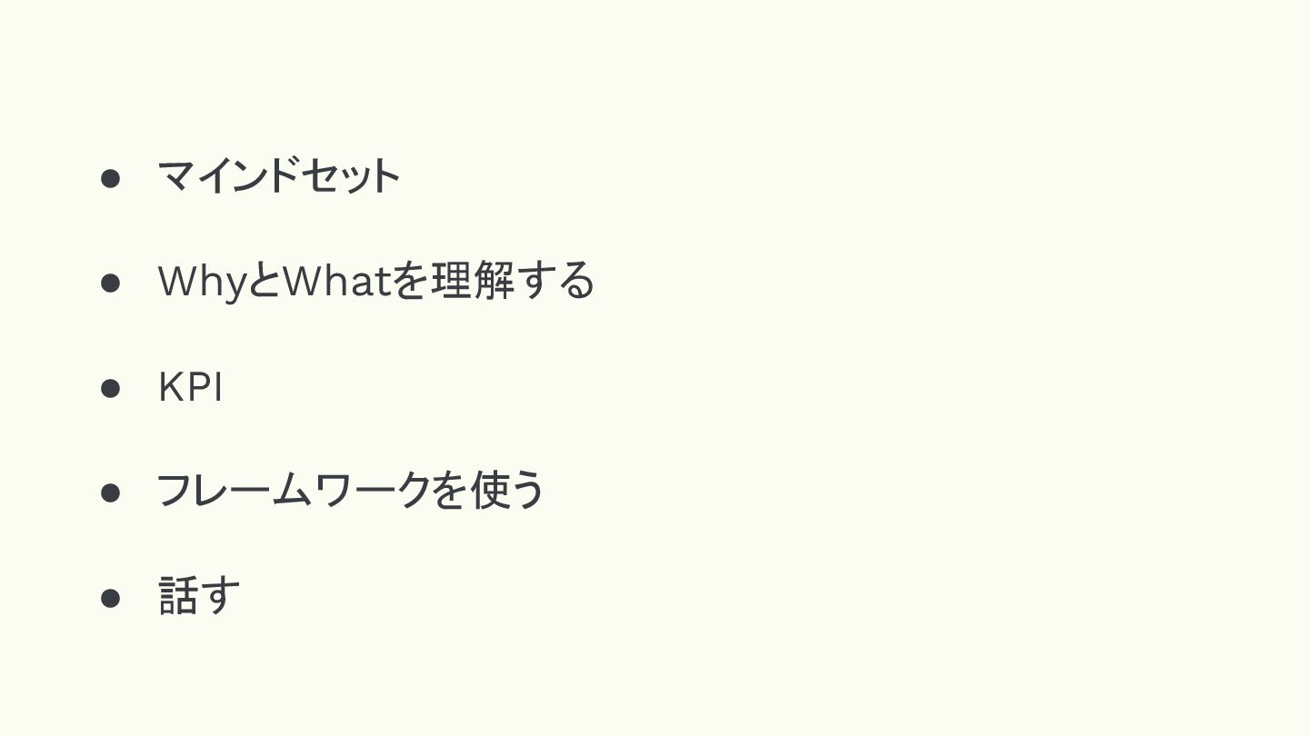• マインドセット • WhyとWhatを理解する • KPI • フレームワークを使う • 話す