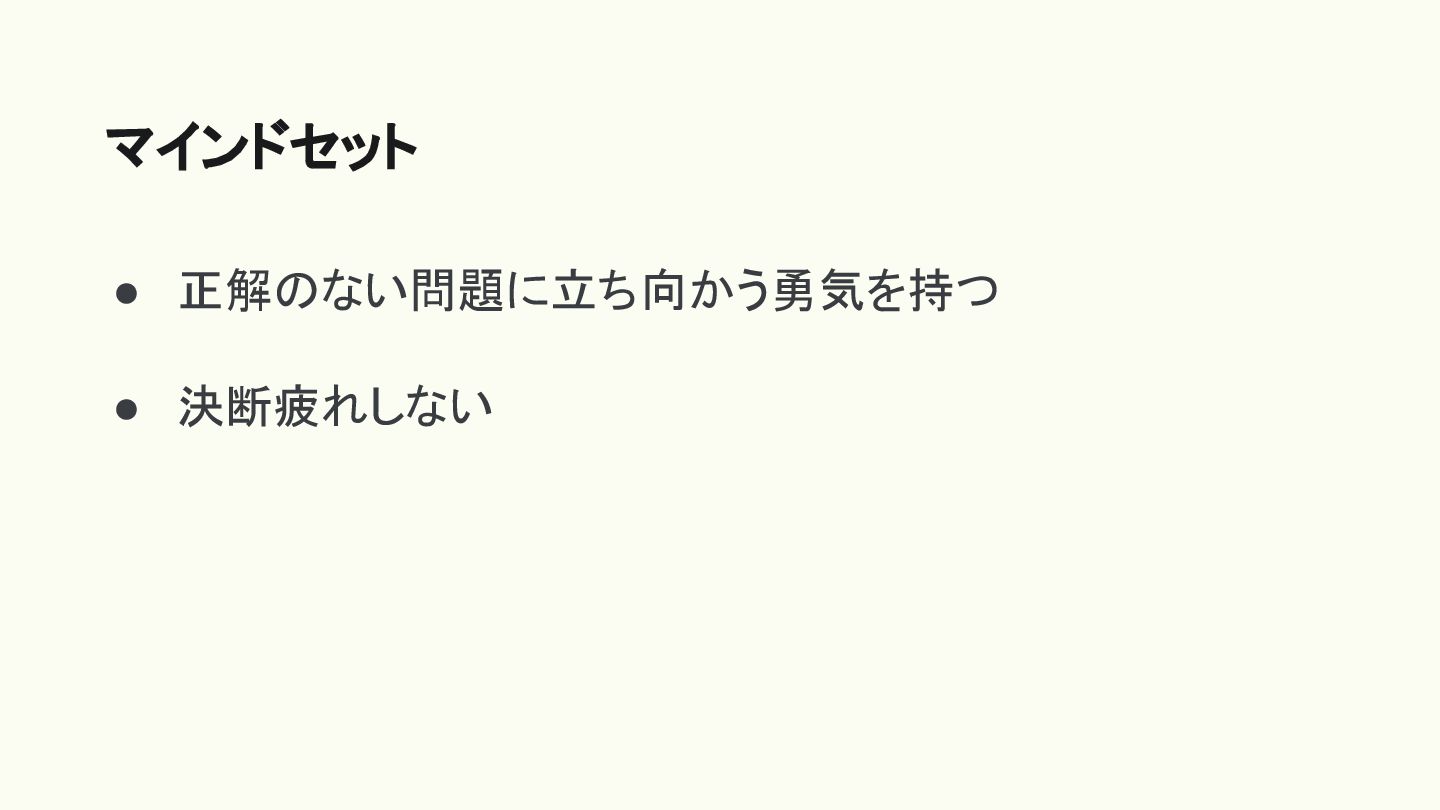 • 正解のない問題に立ち向かう勇気を持つ • 決断疲れしない マインドセット
