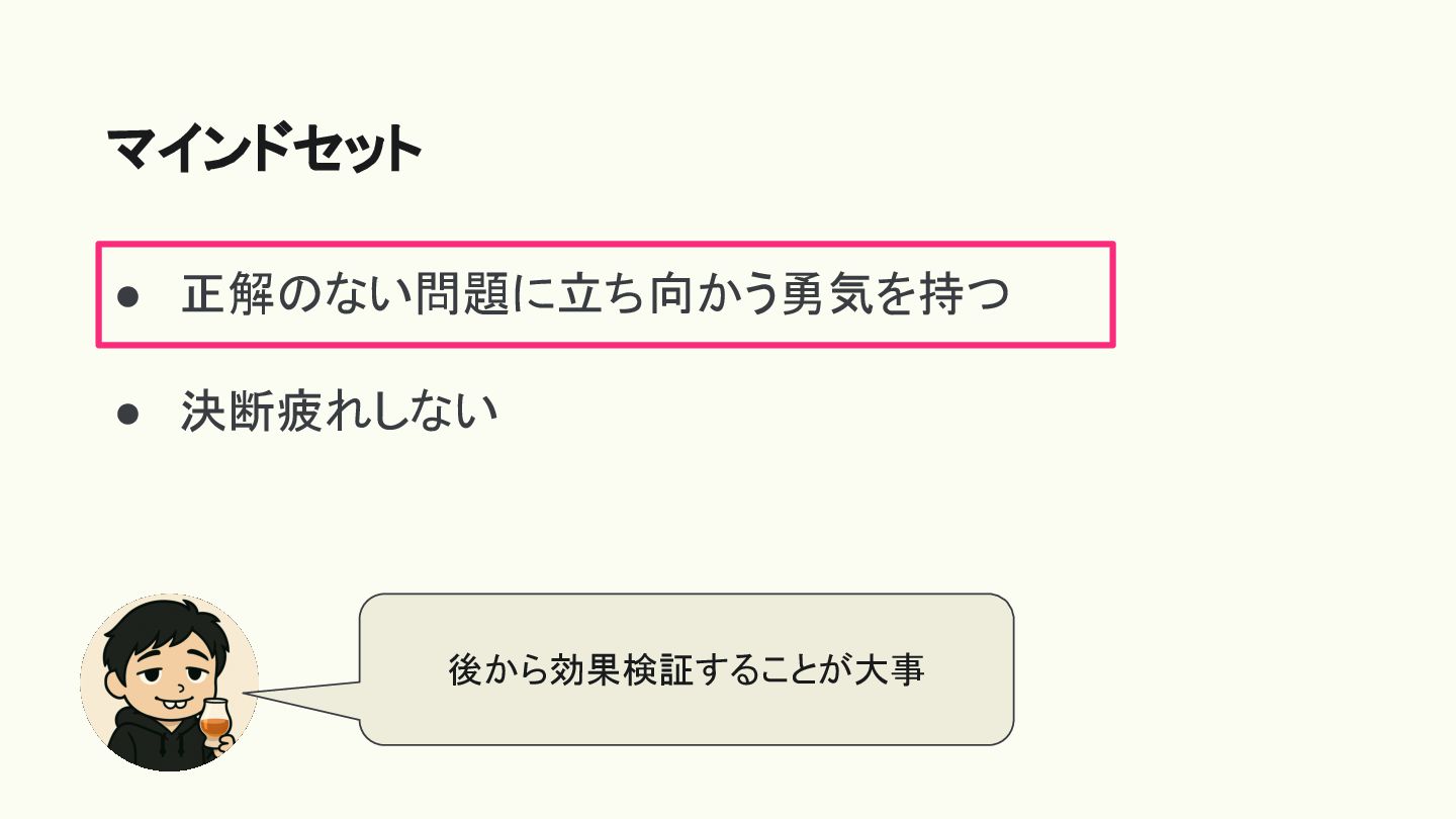 • 正解のない問題に立ち向かう勇気を持つ • 決断疲れしない マインドセット 後から効果検証することが大事