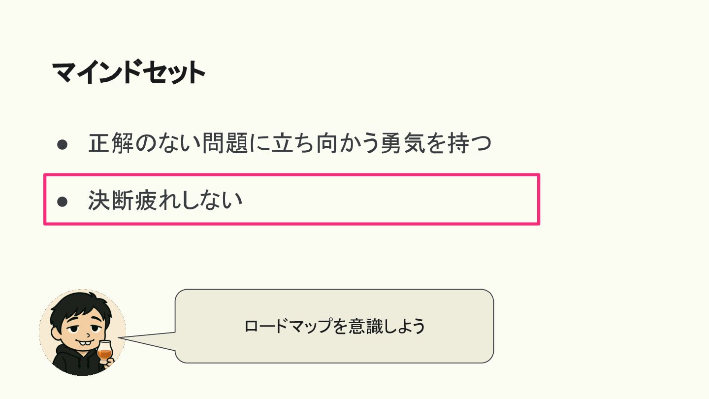 • 正解のない問題に立ち向かう勇気を持つ • 決断疲れしない マインドセット ロードマップを意識しよう