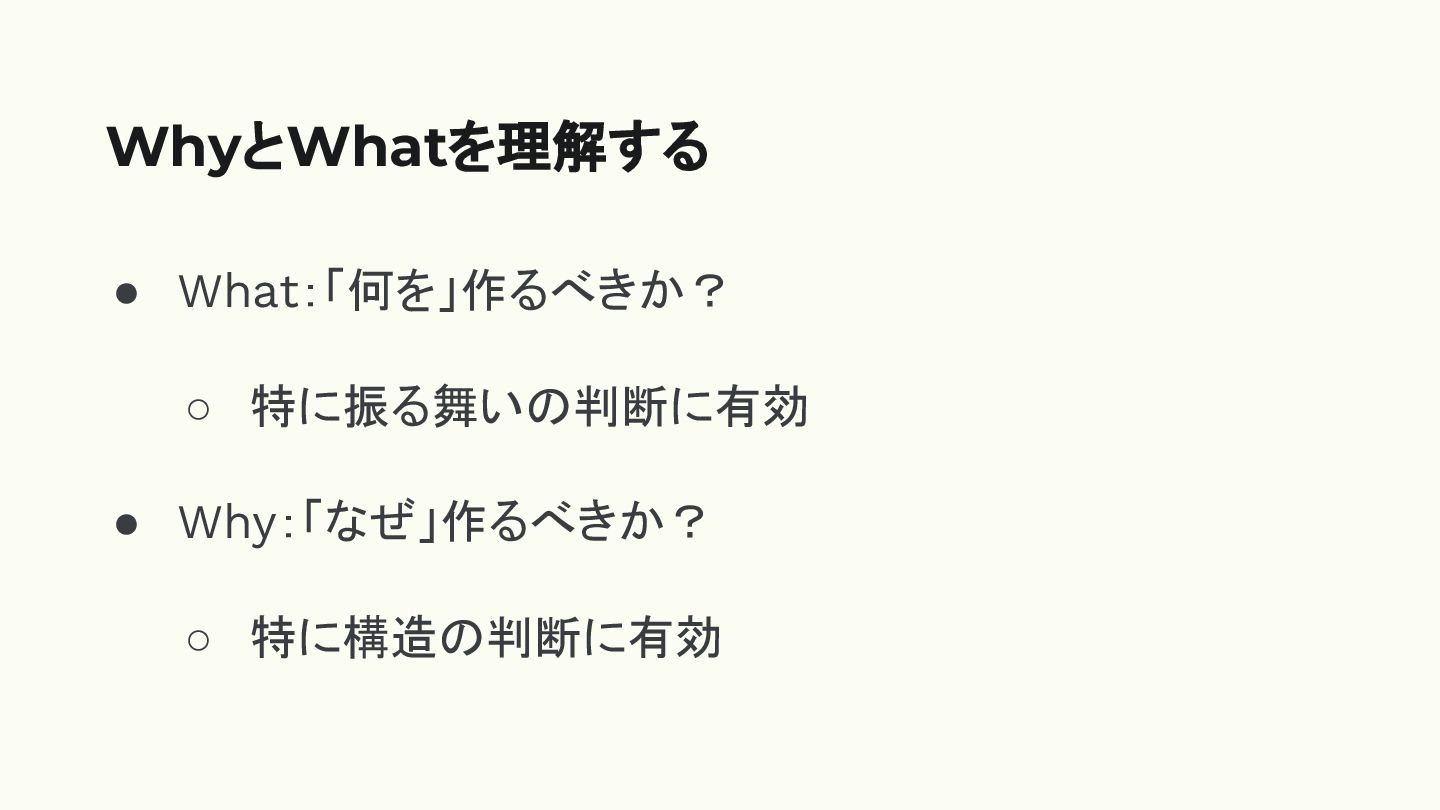 • What:「何を」作るべきか? ◦ 特に振る舞いの判断に有効 • Why:「なぜ」作るべきか? ◦ 特に構造の判断に有効 WhyとWhatを理解する