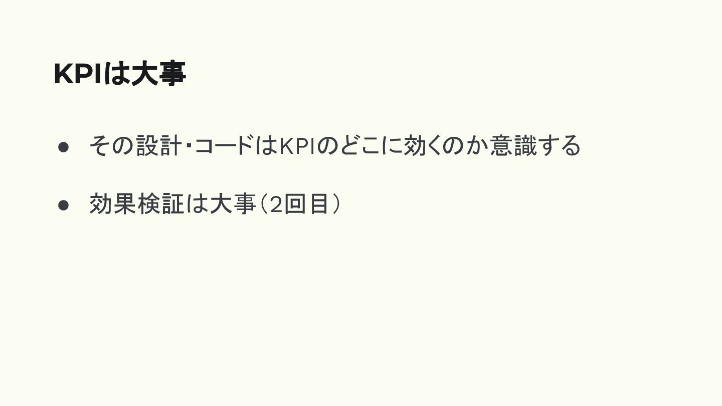 • その設計・コードはKPIのどこに効くのか意識する • 効果検証は大事(2回目) KPIは大事