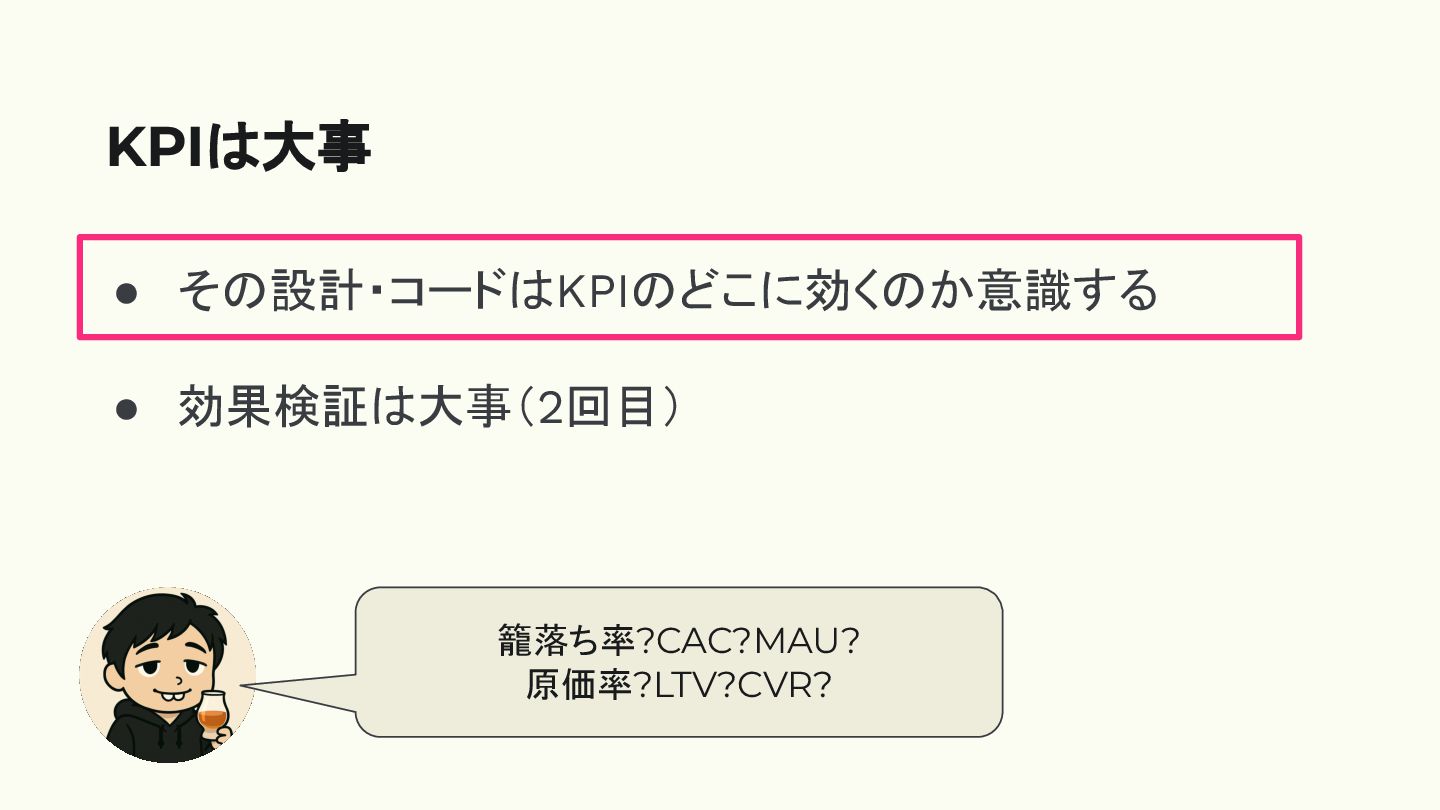 • その設計・コードはKPIのどこに効くのか意識する • 効果検証は大事(2回目) KPIは大事 籠落ち率?CAC?MAU? 原価率?LTV?CVR?
